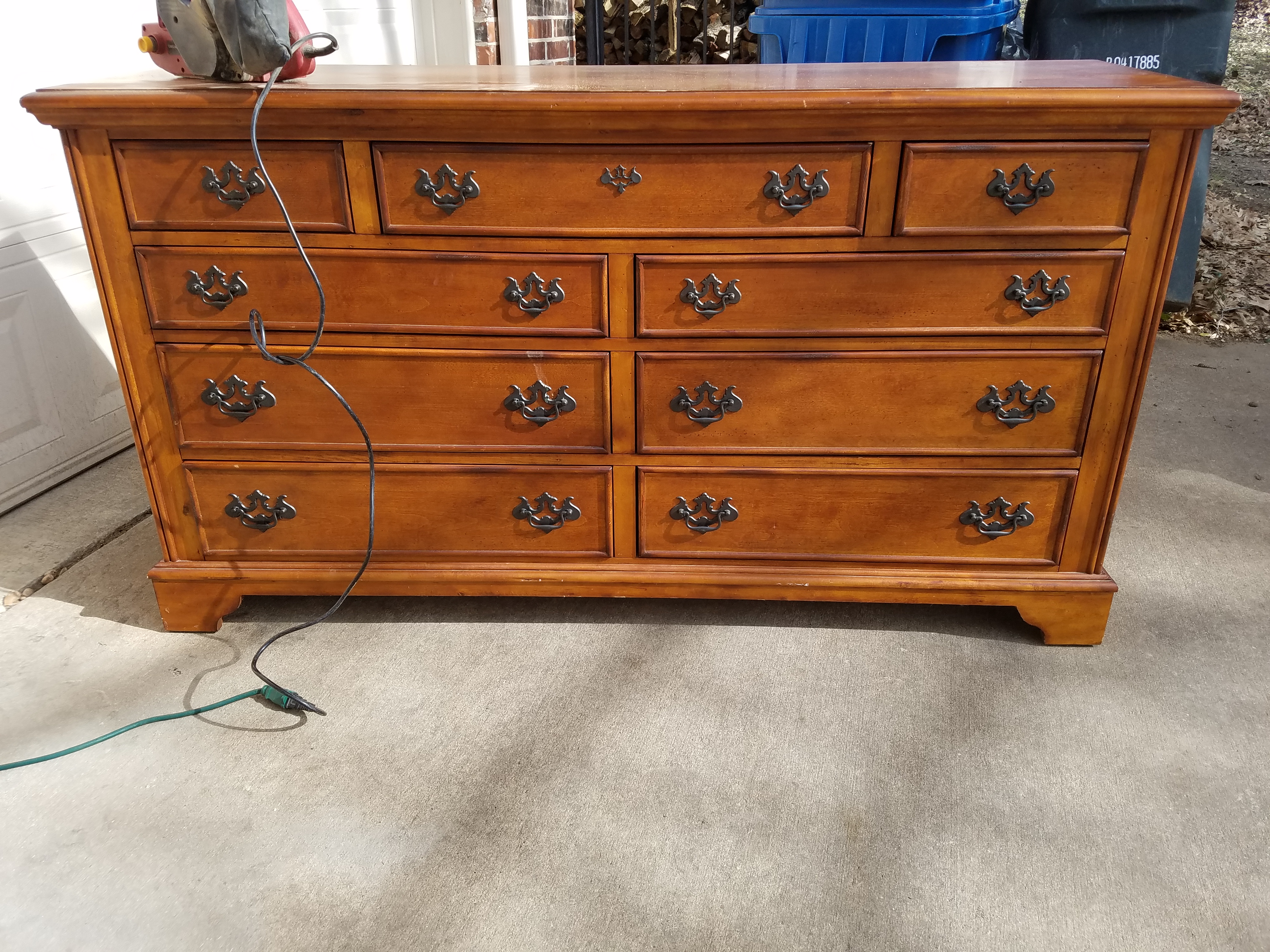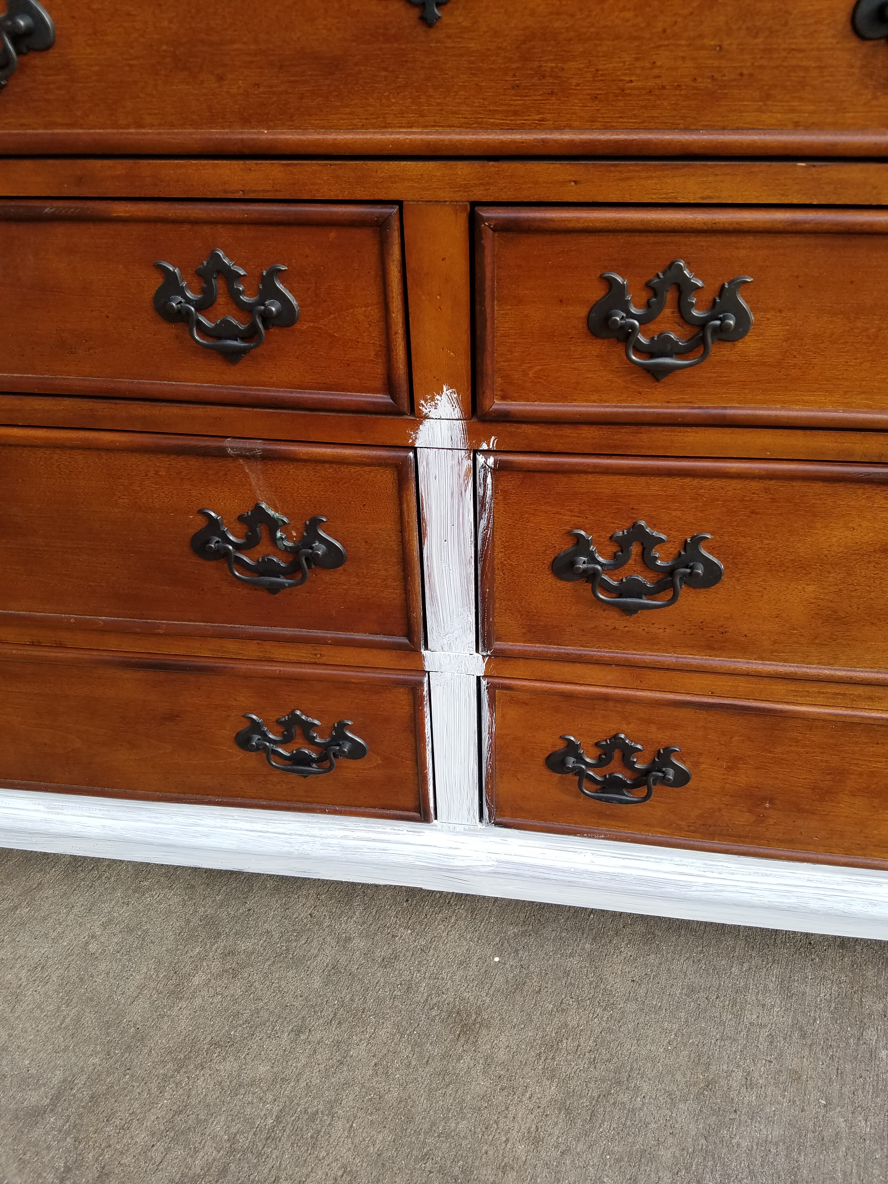 My husband actually found this dresser in our old neighborhood and called to see if I wanted it! Duh! Of course! We have been looking for something to use in our older son’s bedroom! This was in mostly great shape…barring a little re-stapling of the backing.
