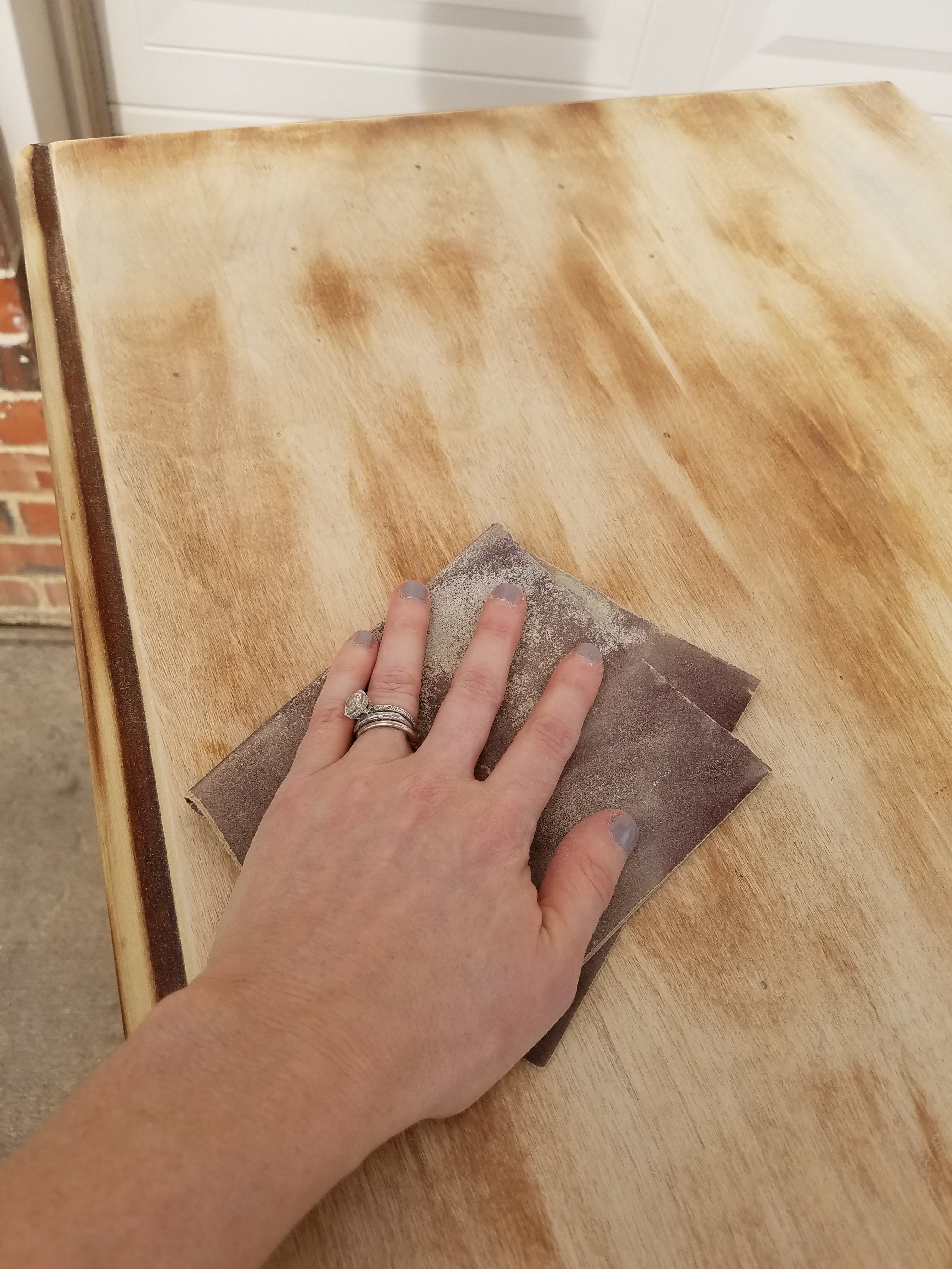 Most people are intimidated by sanding…even some of the best refinishers! It adds extra steps. It is messy. You really need to do it outside to avoid a huge mess! It takes some armwork! I happen to love a good beltsander, and mine is old, old, old….but it keeps ticking so I keep using it! Now, a lot of furniture seems to have a laminate finish on the top. I have a love/hate relationship with that and a sander. It gunks it up. Too much sanding takes you down to particle board. You have to get it just right, but it can reveal a really beautiful piece of wood with lines and grooves and movement! I love seeing the slice of a tree! It is beautiful what God made! I finished with a light staining with a Red Mahogany stain.
