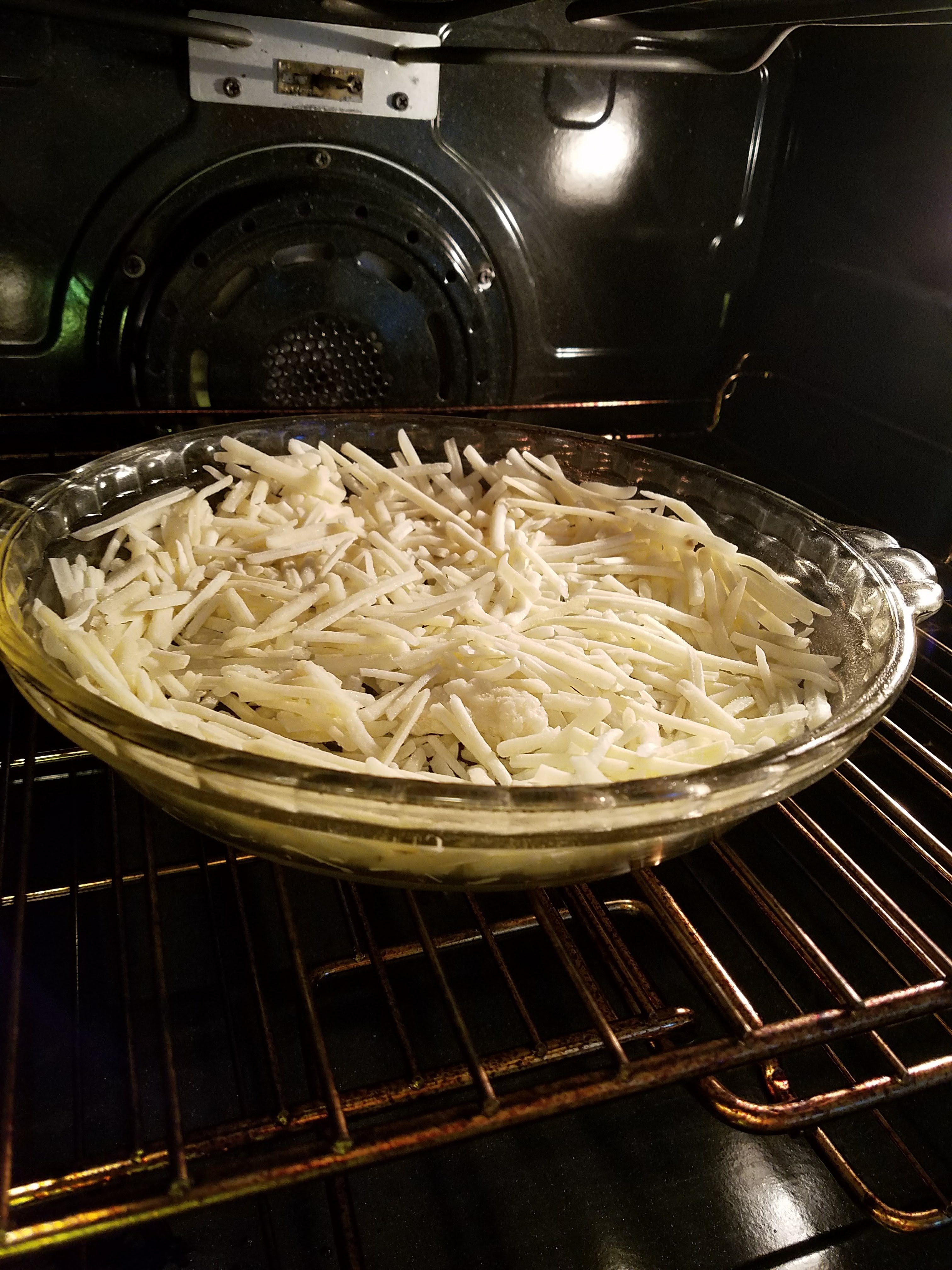 Preheat oven to 400 degrees. Line a pie plate with hash browns, and press them into the sides. Spray a light coating of oil on the hashbrowns with coconut oil spray so they crisp up a little in the oven. Bake for about 10 minutes or so just until they very slightly start to brown.