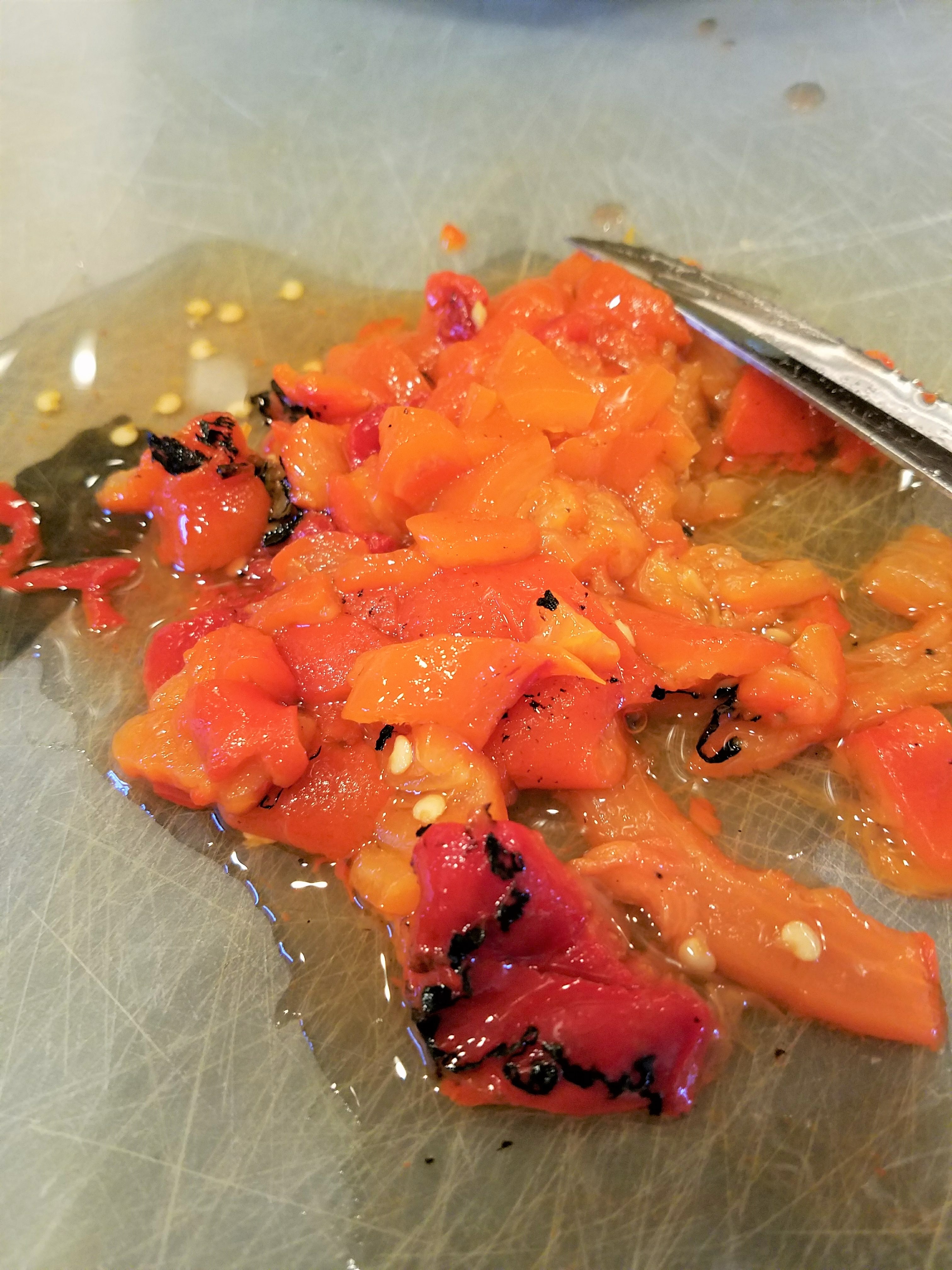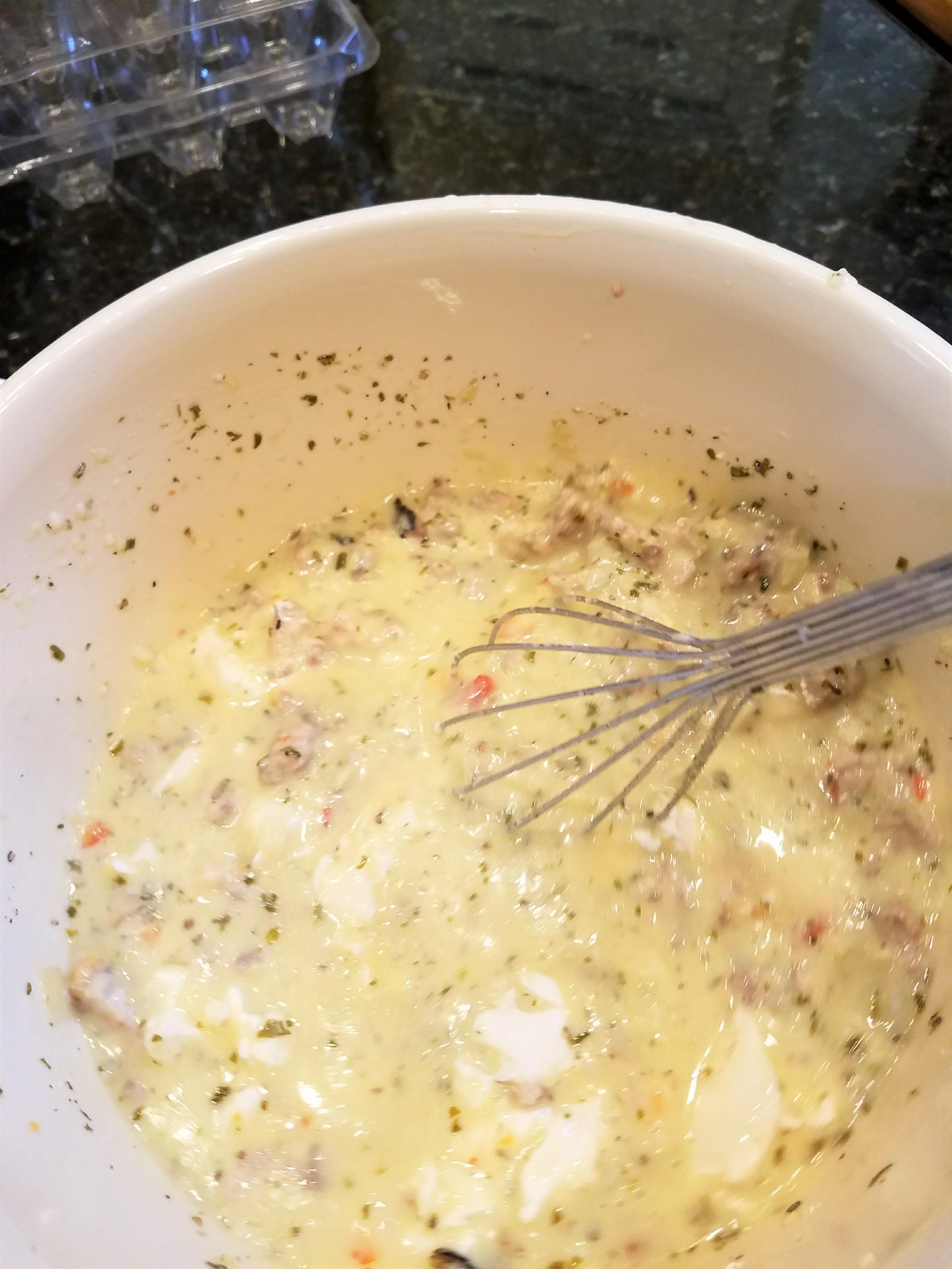 In the meantime, crack and whip eggs into a mixing bowl, add milk, cream cheese (in chunks….it won’t mix in completely…that is okay!), shredded chicken, and pesto! For this time, I also added fire roasted red peppers and oregano to give my quiche a more Italian taste!