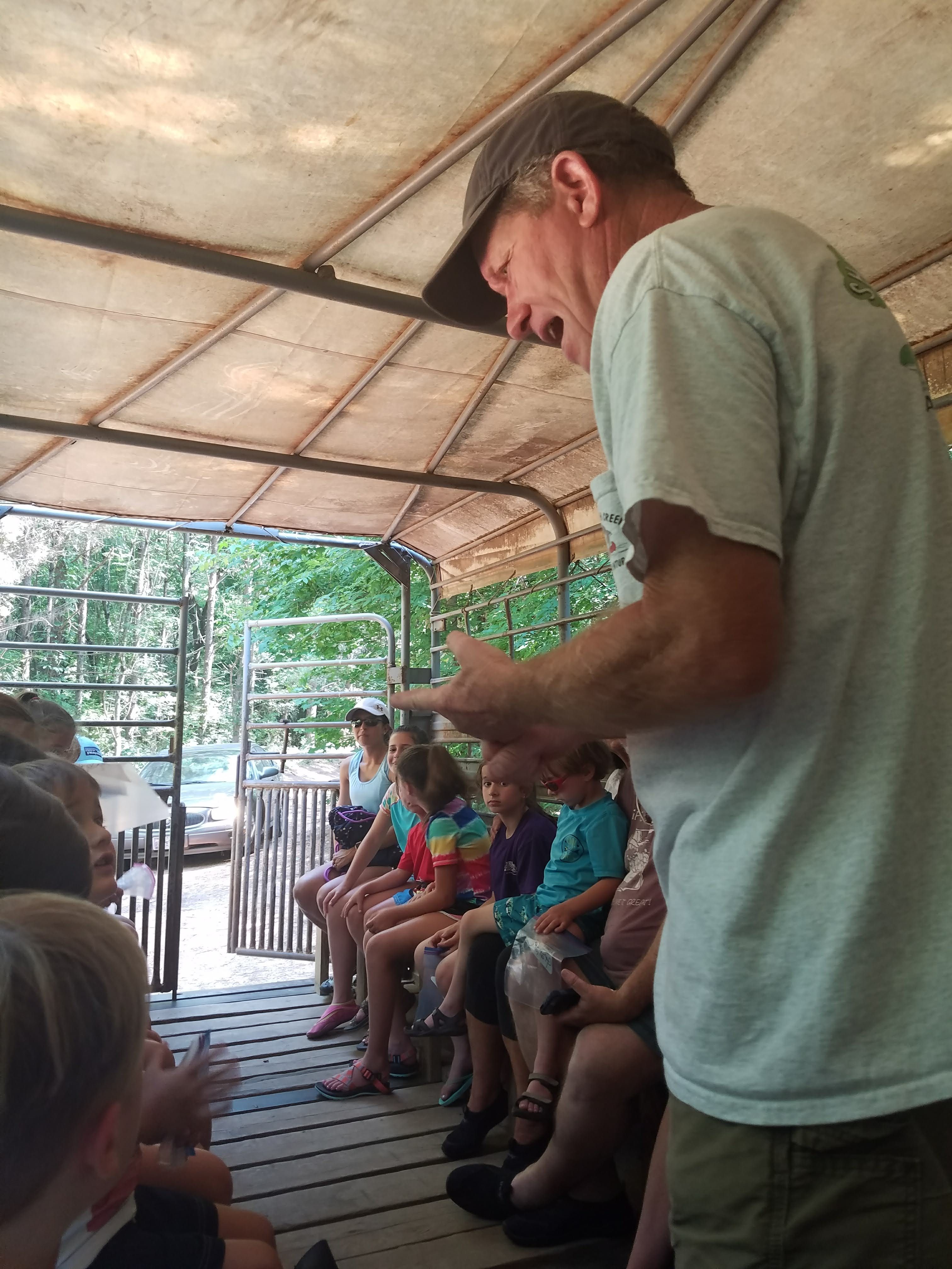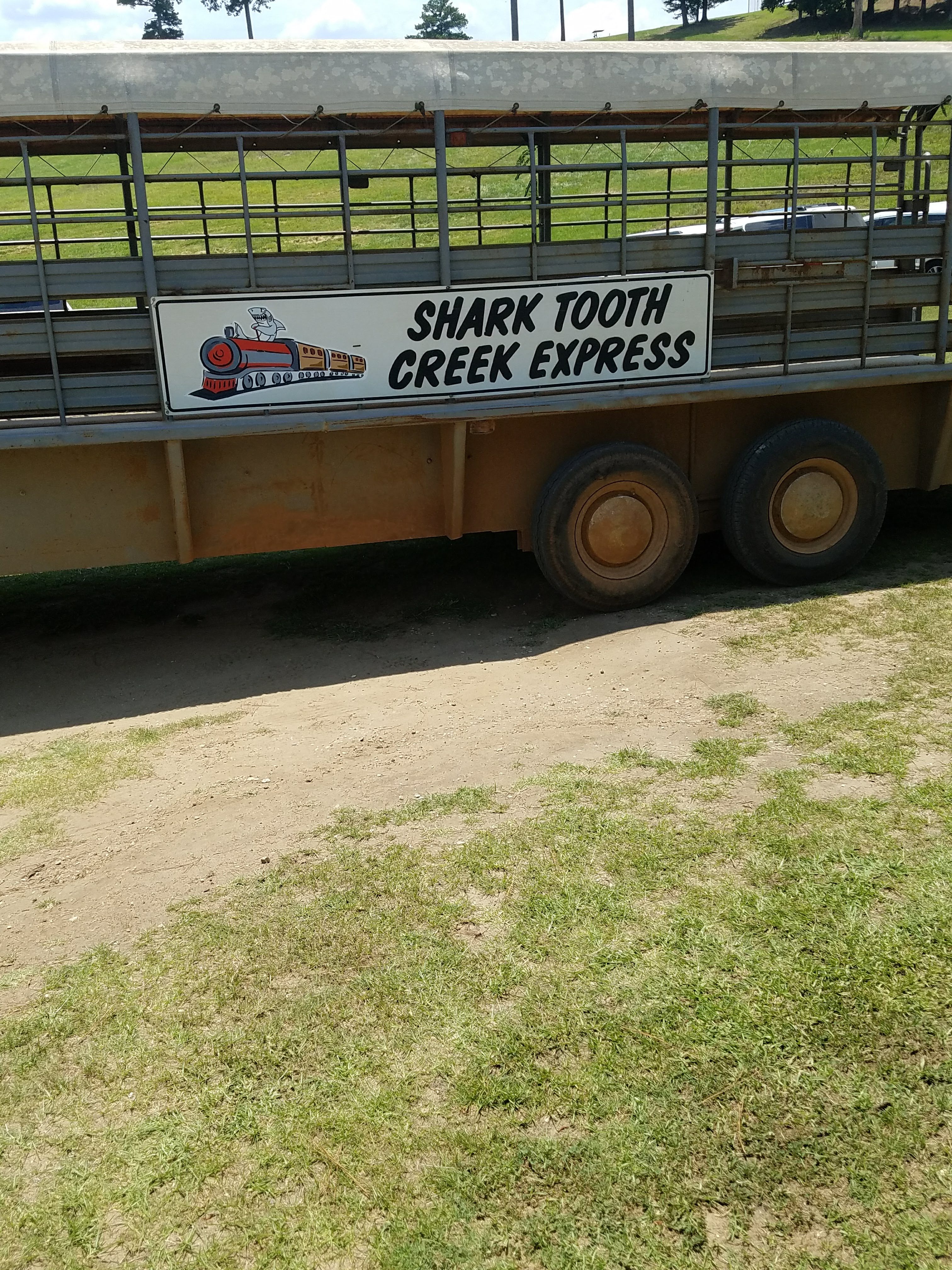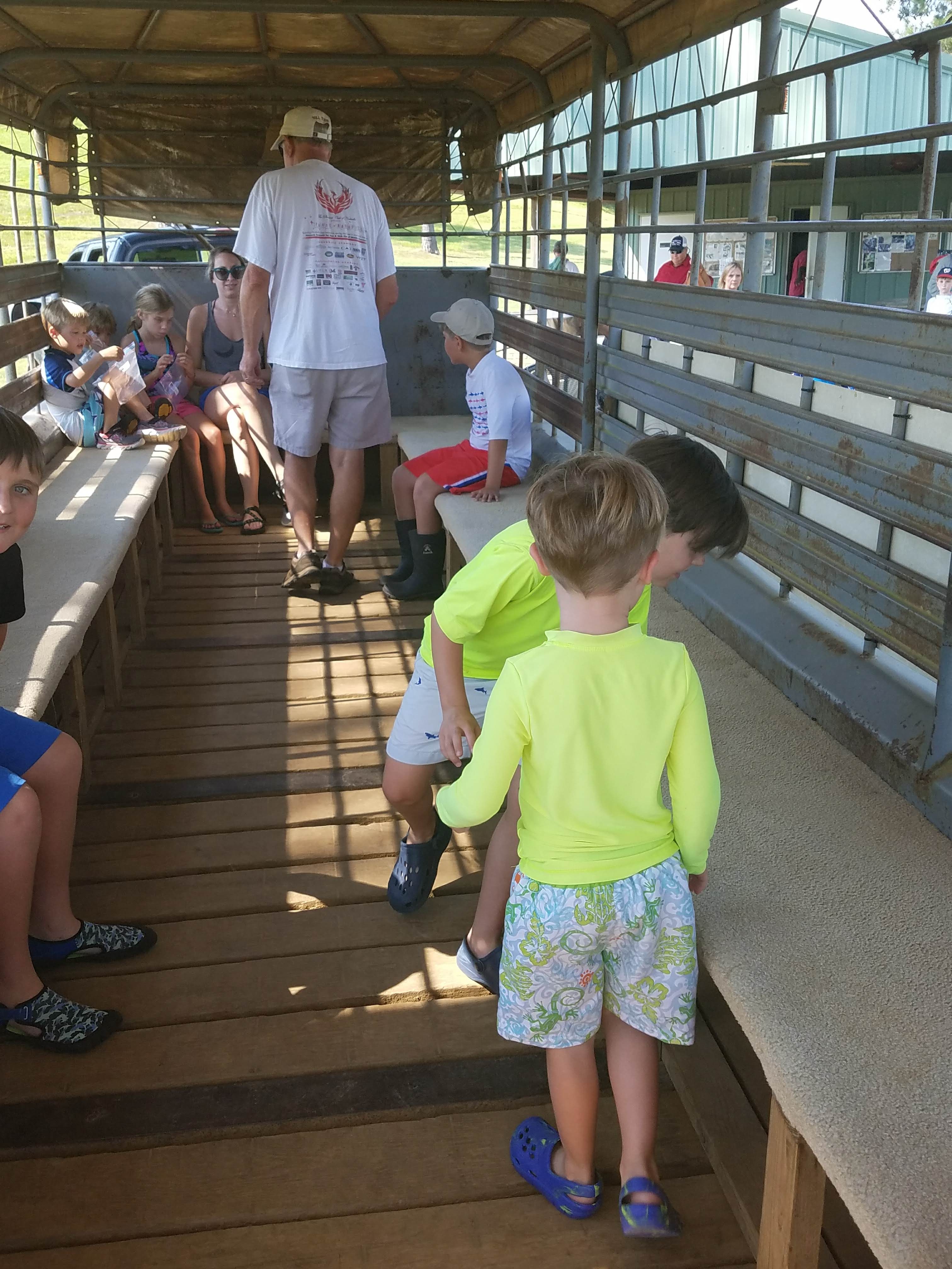 Next up, we loaded into a cattle trailer called the Shark Tooth Creek Express….aka a retrofitted cattle trailer with bench seats on both sides. He asked all the kids whether they wanted to go “slow and smooth” or “fast and bumpy???” Well, you know the answer to that question was a very loud and excited, “Fast and Bumpy!!!!” And we were off!!!! And let me tell you, the kids were squealing with pure delight, and the parents might have been holding on to dear life….haha! It was a blast though!!