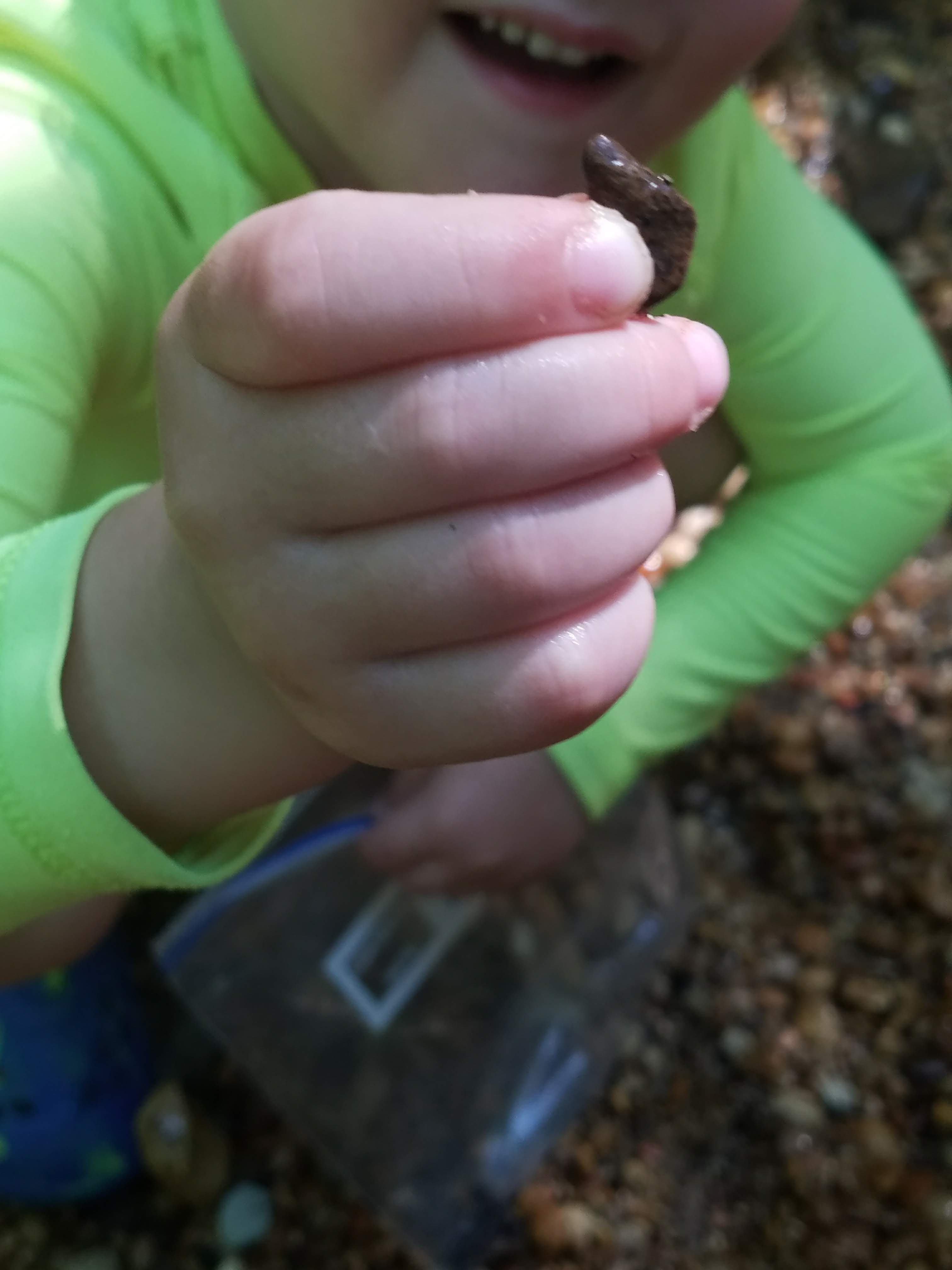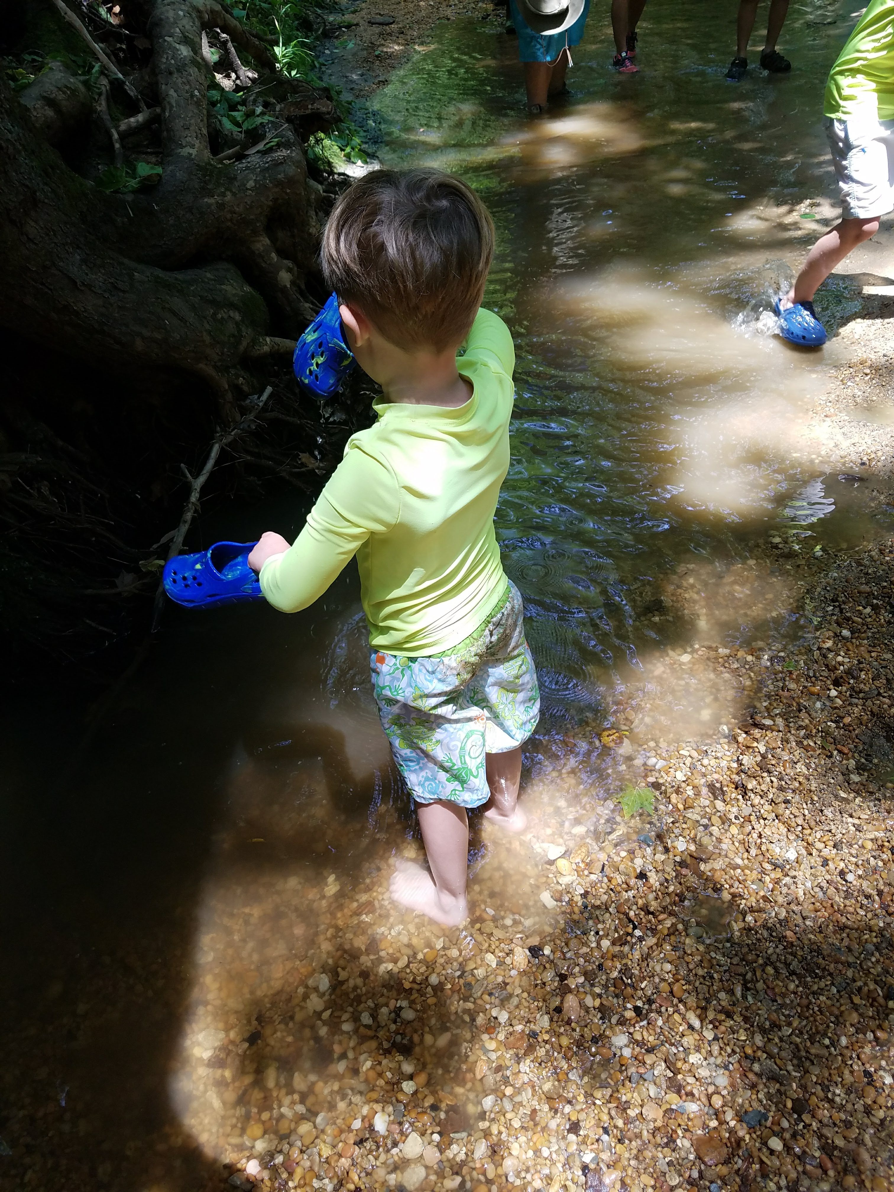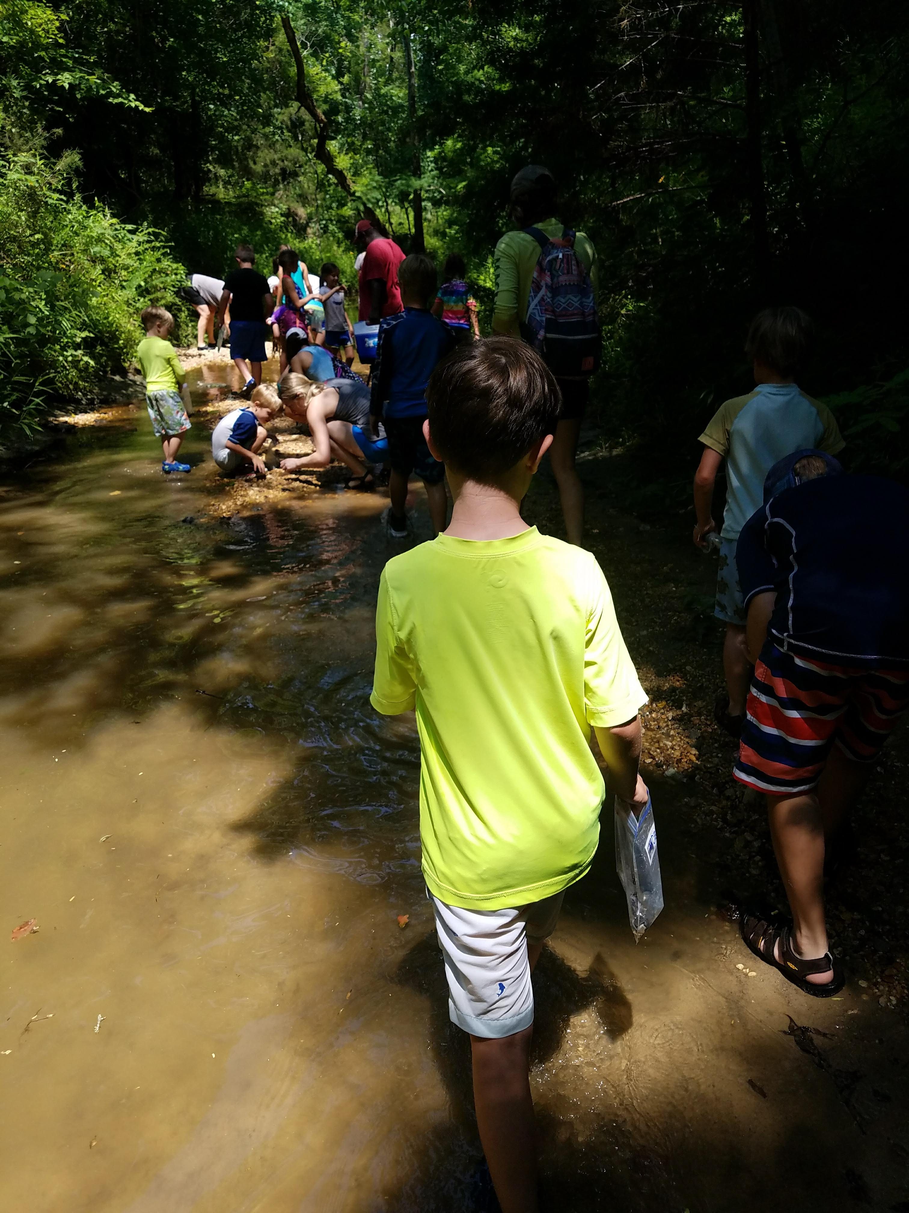 We all unloaded, applied lots of bug spray, and were led down into the creek by Mr. Ken and his assistant! The creek was partitioned off into three sections so we began searching in the first section. Some families had brought colanders and other sifting tools….they must have received insider tips…haha! We simply used our hands!