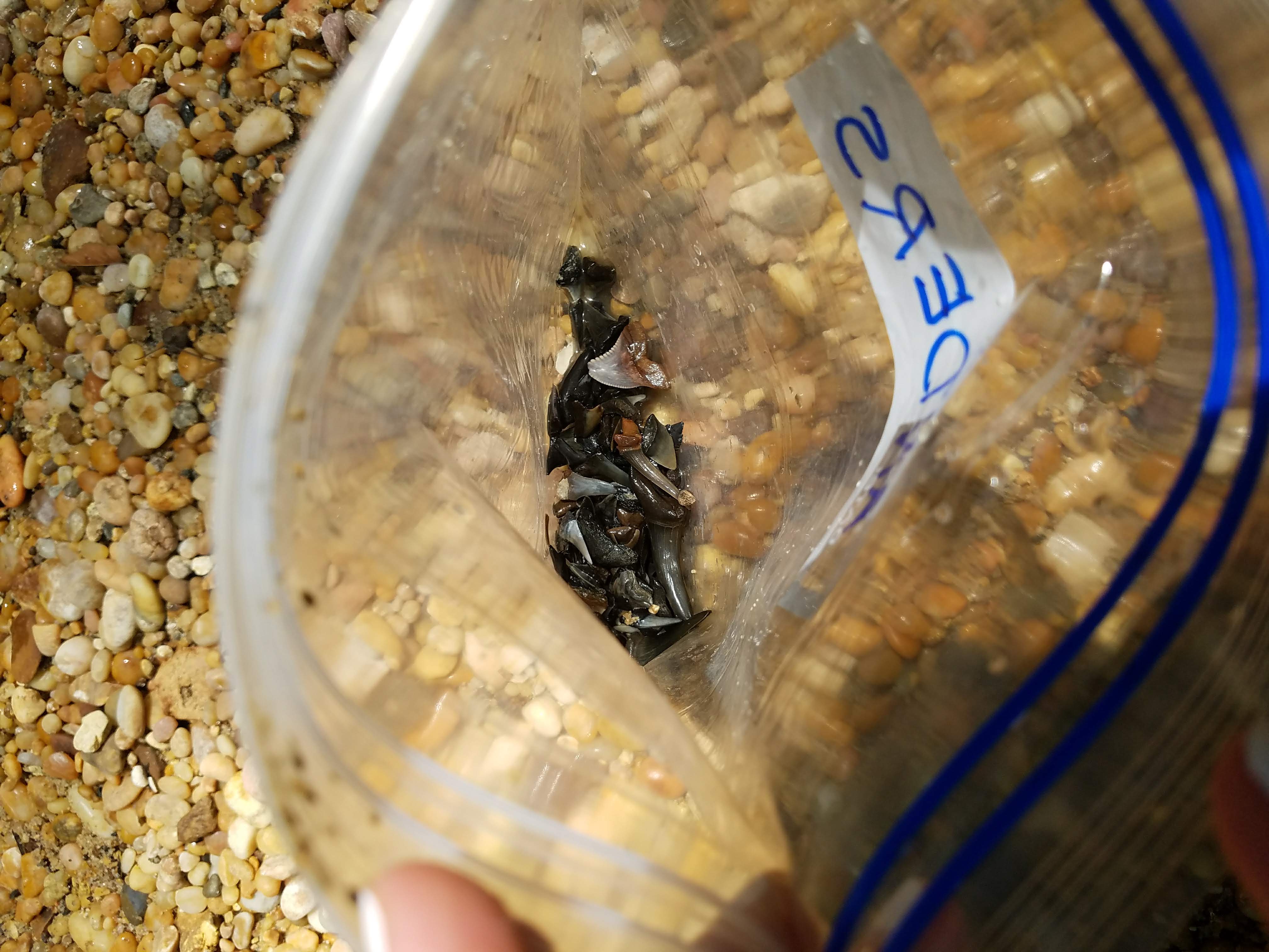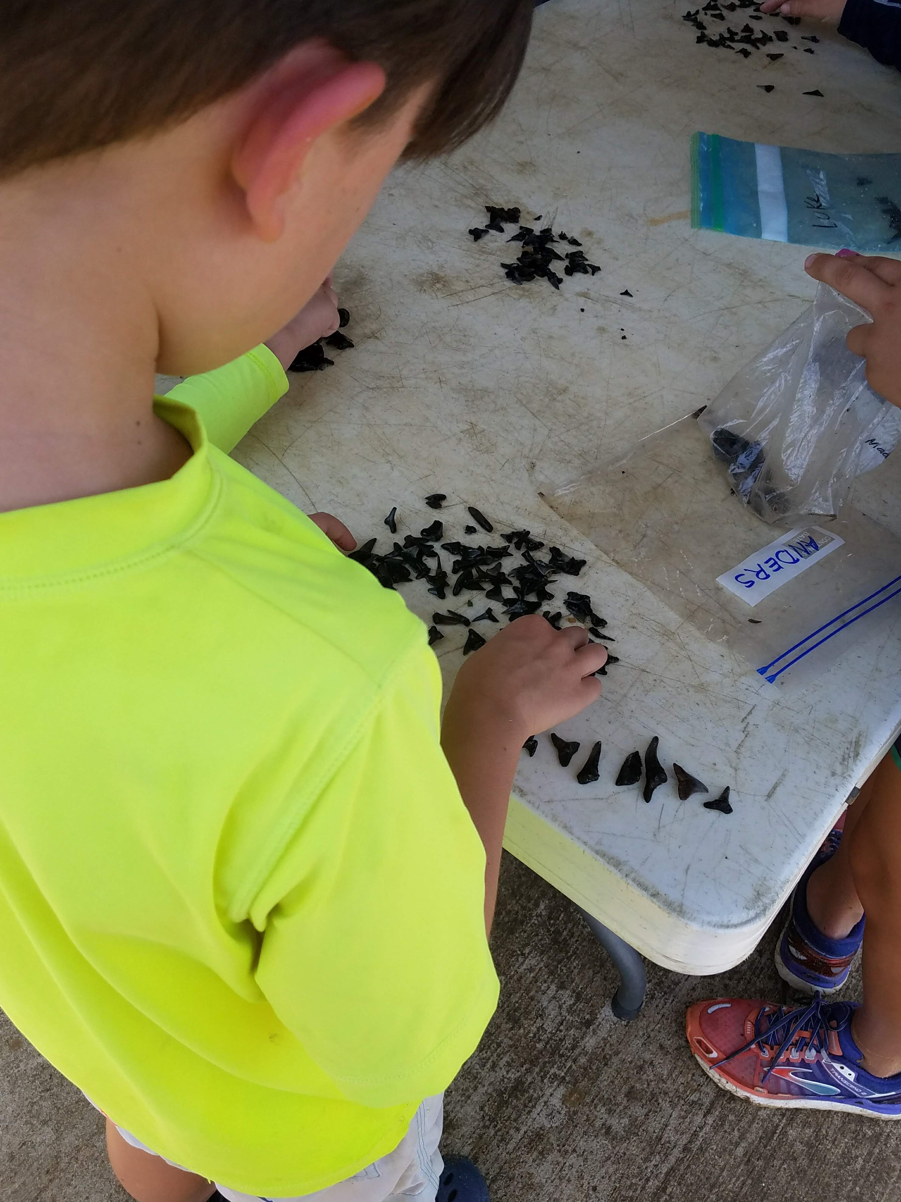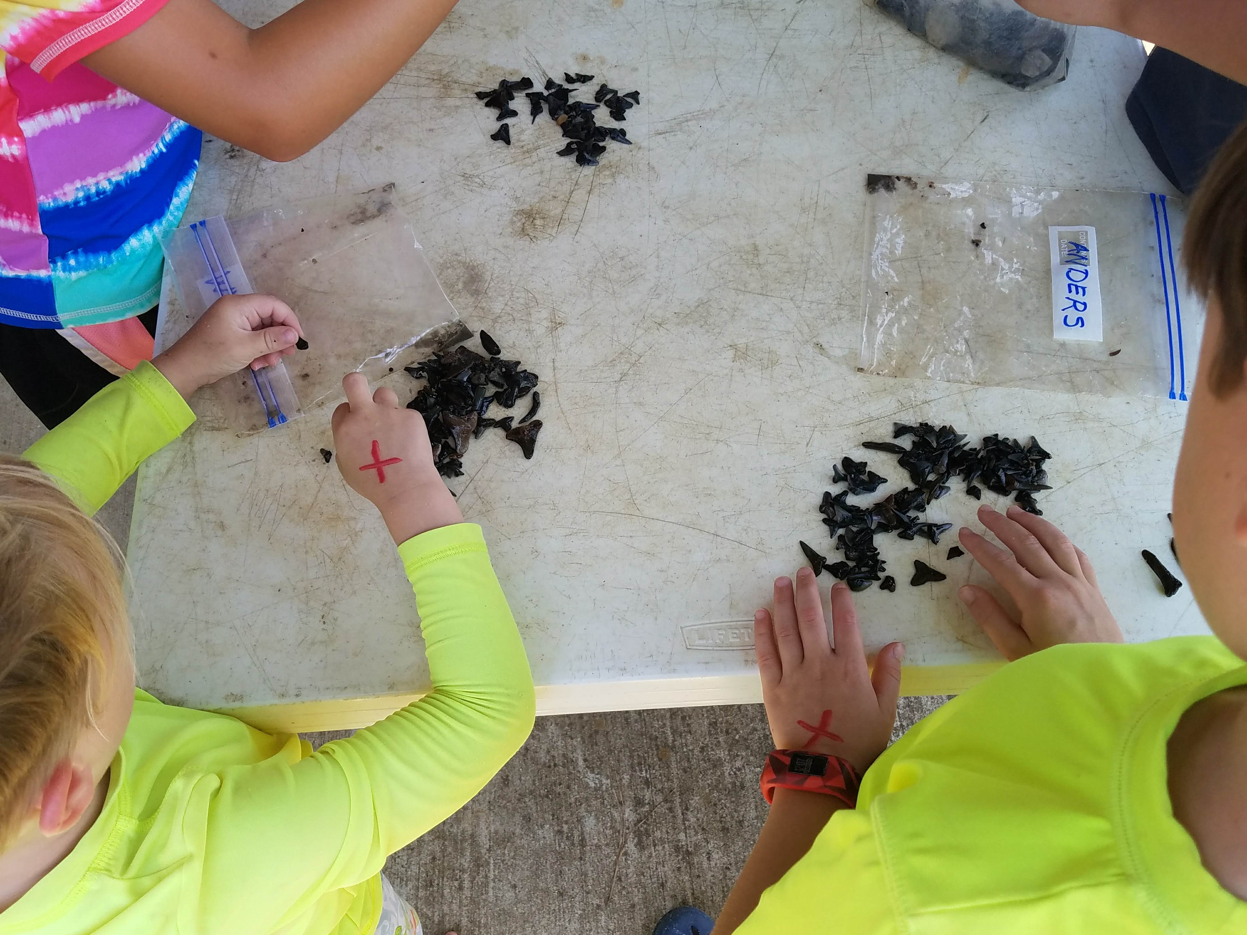 We had been instructed to pack sunscreen, bugspray, a towel, water shoes (not flip flops!), a sack lunch, and a freezer quality quart sized baggie with each child’s name written on it. This was important….a regular non-freezer baggie wouldn’t hold up to the shark teeth…some are extremely sharp!