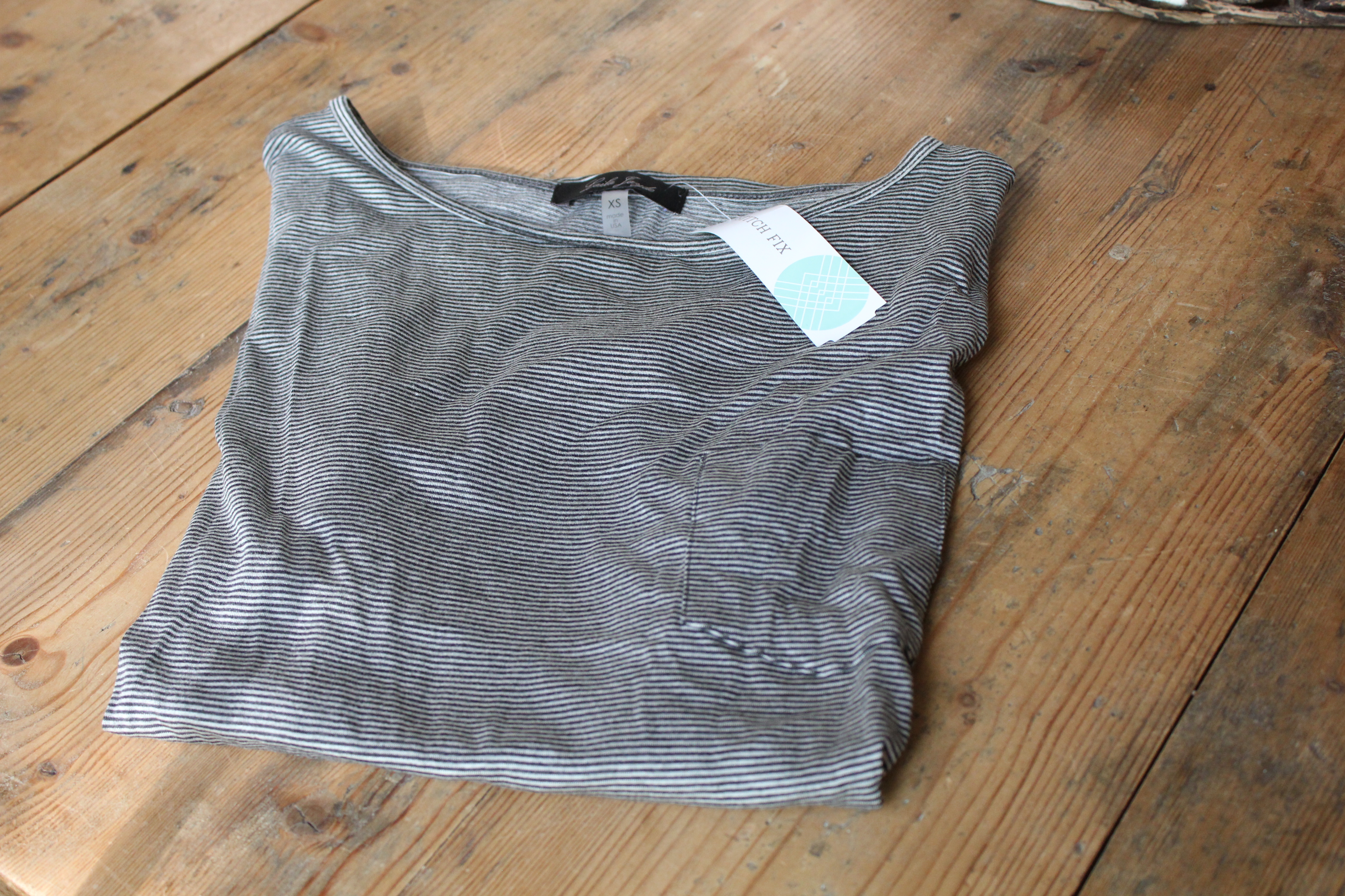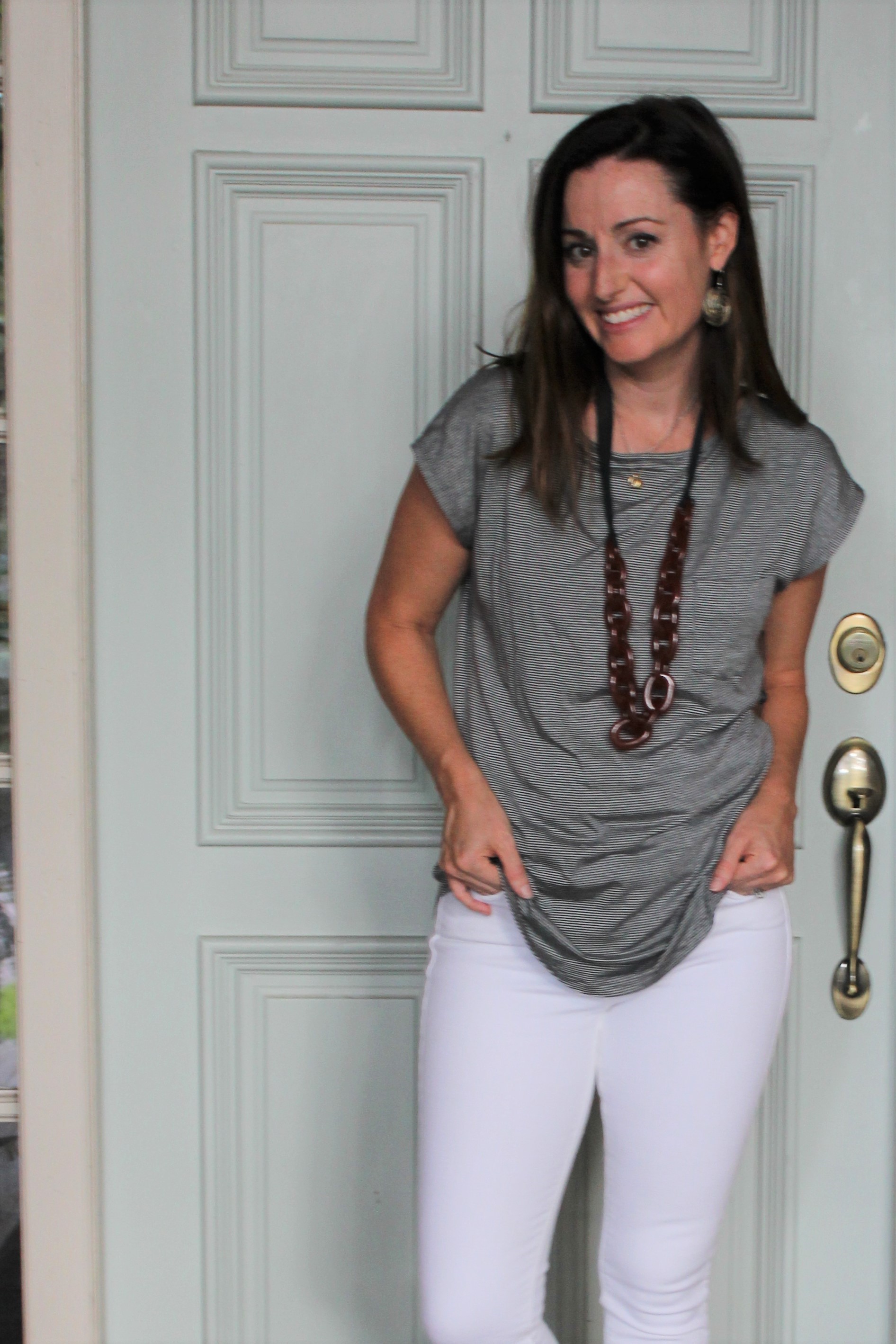 Chan had thought through the process so well! I love stripes so she started with a striped tee! I wish you could feel this one in person! It is so soft, and I am a huge fan of this hemline where it dips in the front and back and is shorter on the sides.