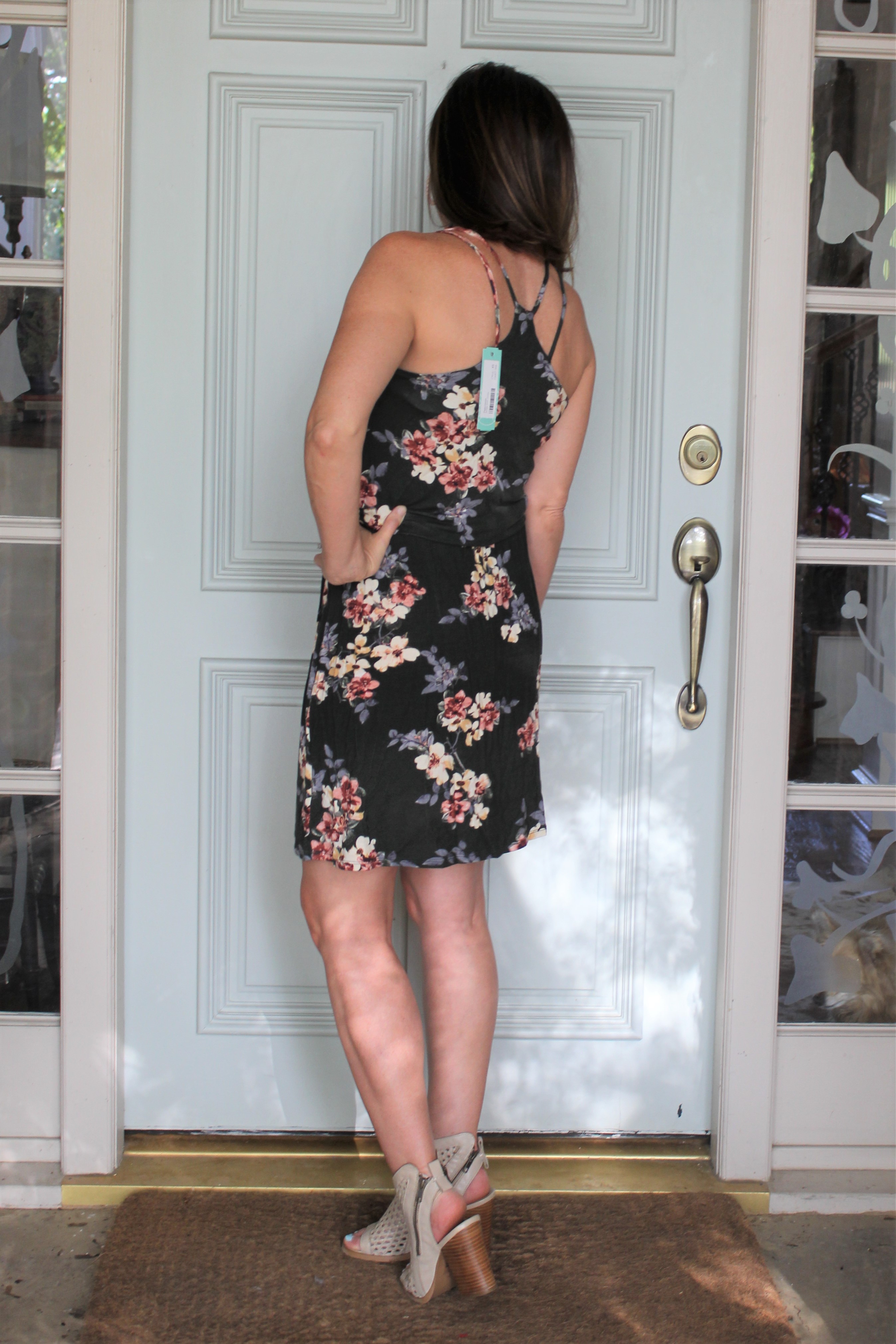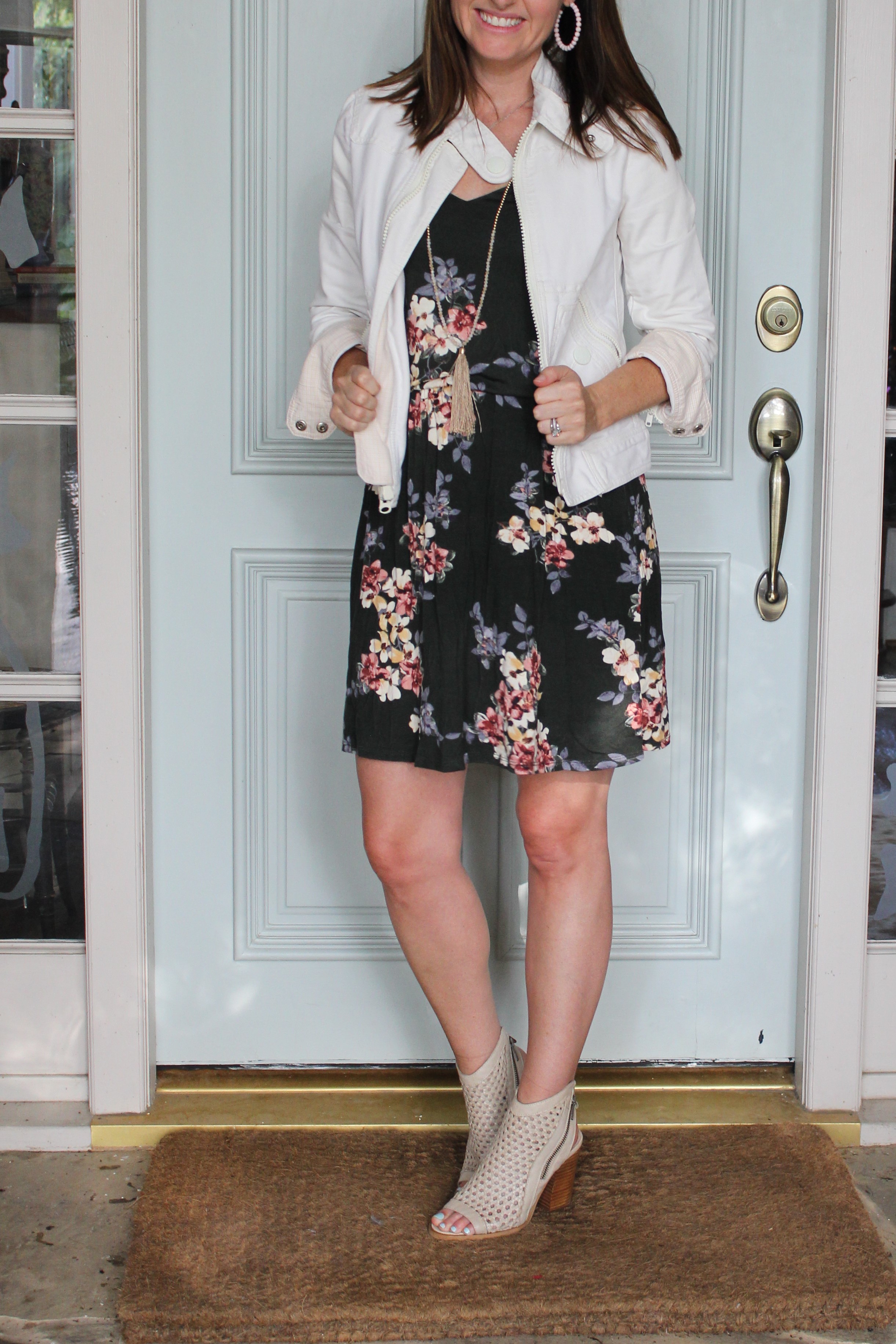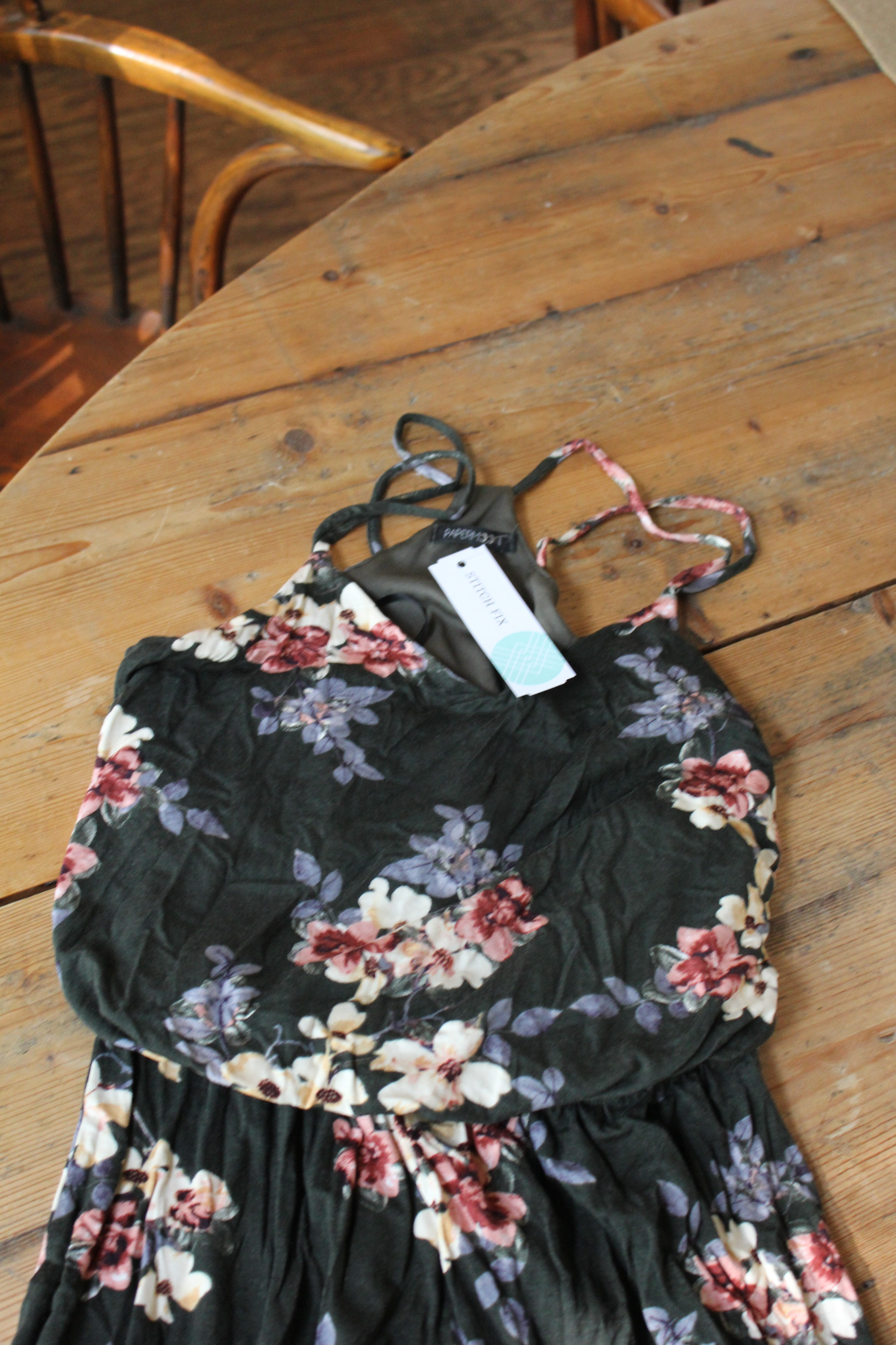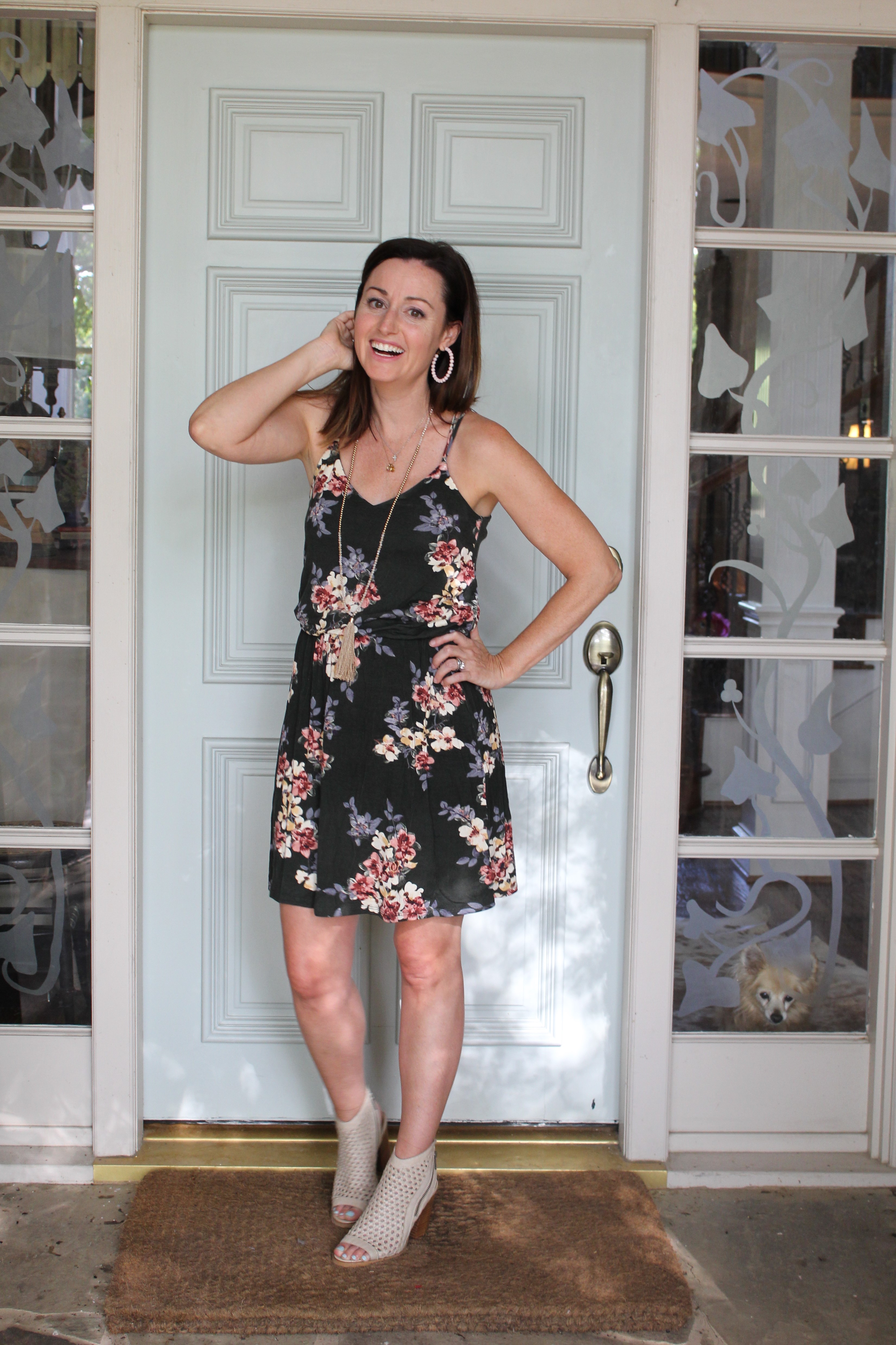 Florals are such an easy way to add a pop of femininity, but they can feel sort of “spring-y” in season. This dress was actually perfect for right now and heading into fall! It is this dark gray tone….almost a really, really deep gray/green color, and the floral accents are totally in fall tones! When I put this on, it fit like a dream! And I kind of felt like I was wearing a nightgown which in my book is a win. Comfort is always key!