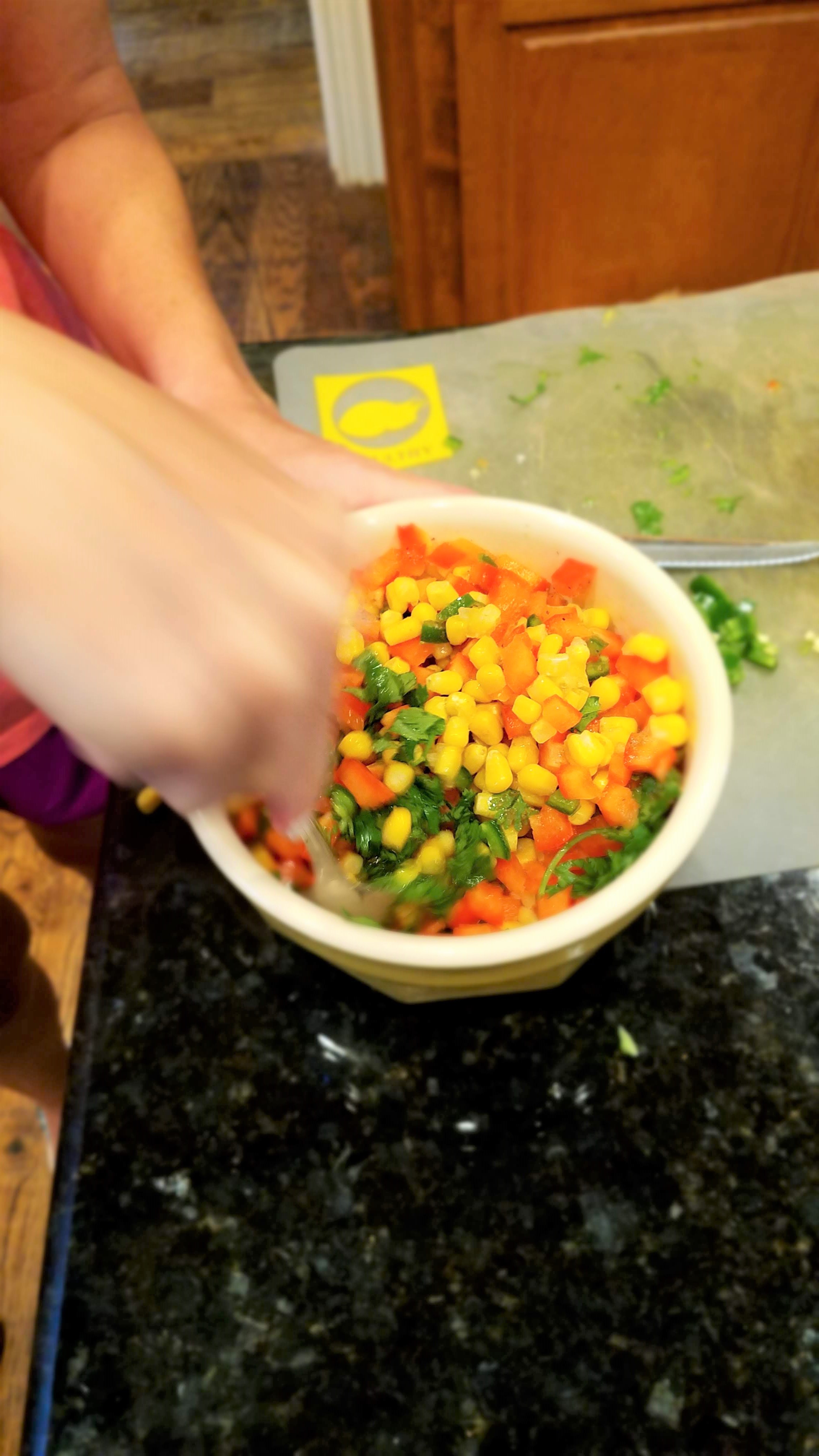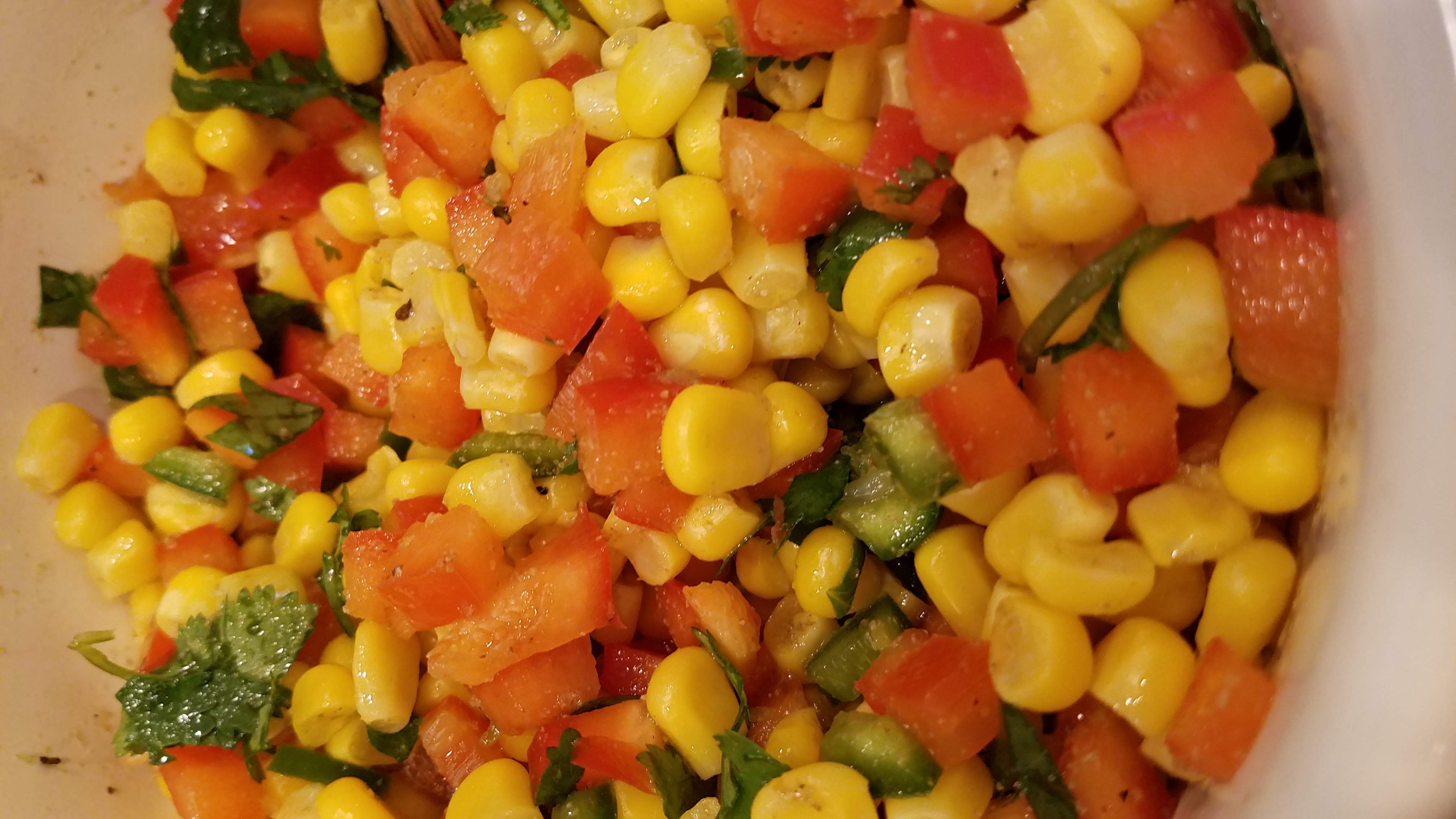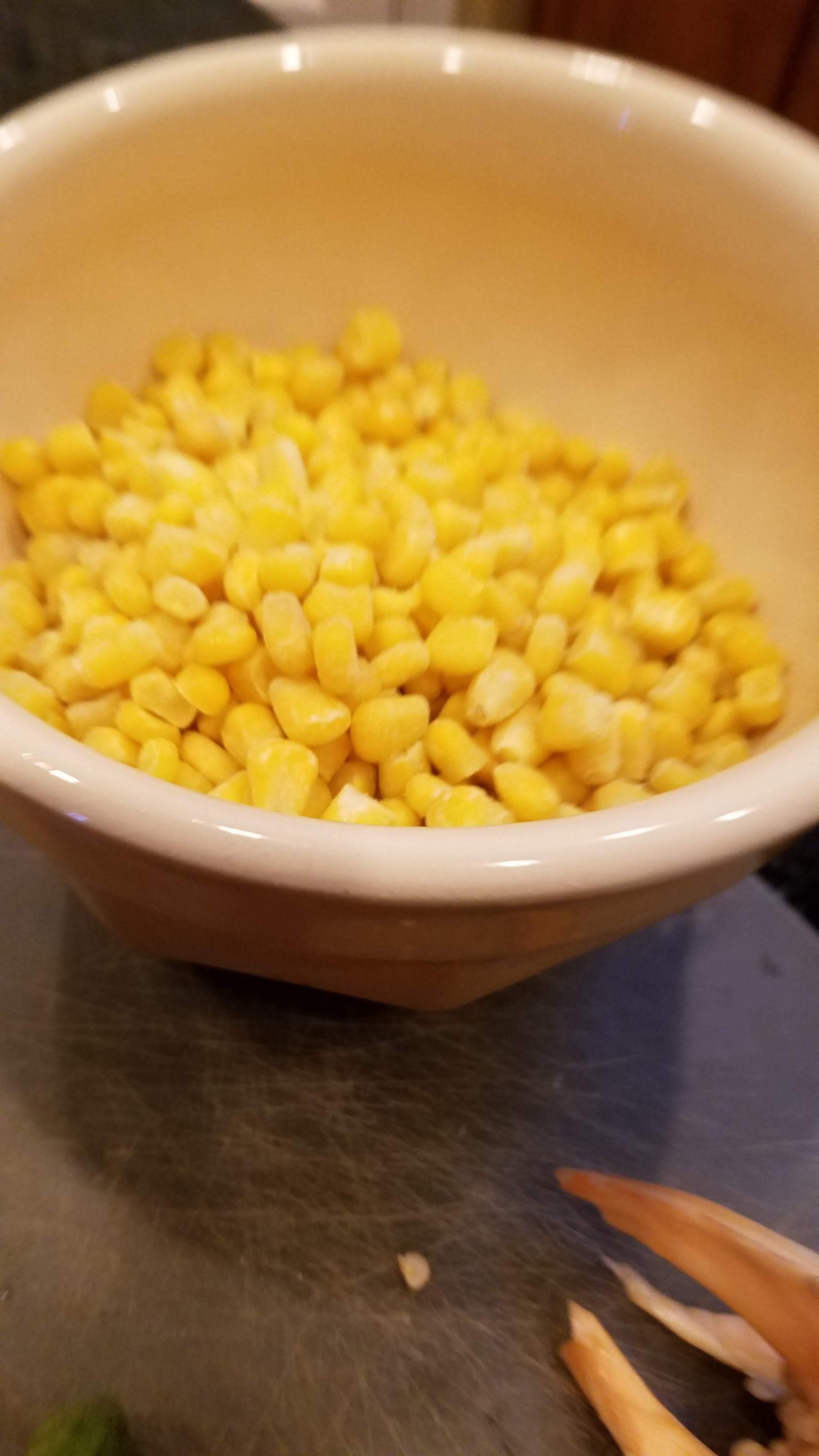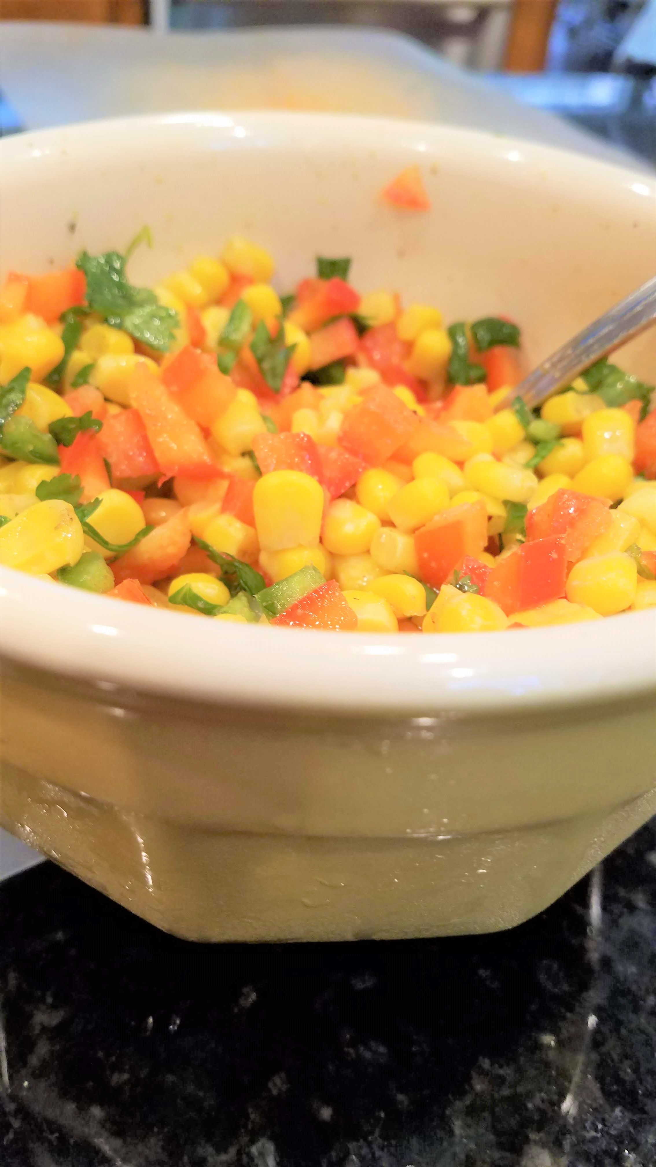 You start with either frozen corn….or you can lightly steam 2-3 ears of corn in the microwave (2 min per ear…and then cut it off the cob). I prefer using one package of frozen corn because it is quick and easy, and I can always have one in the freezer. Empty the corn into your bowl.