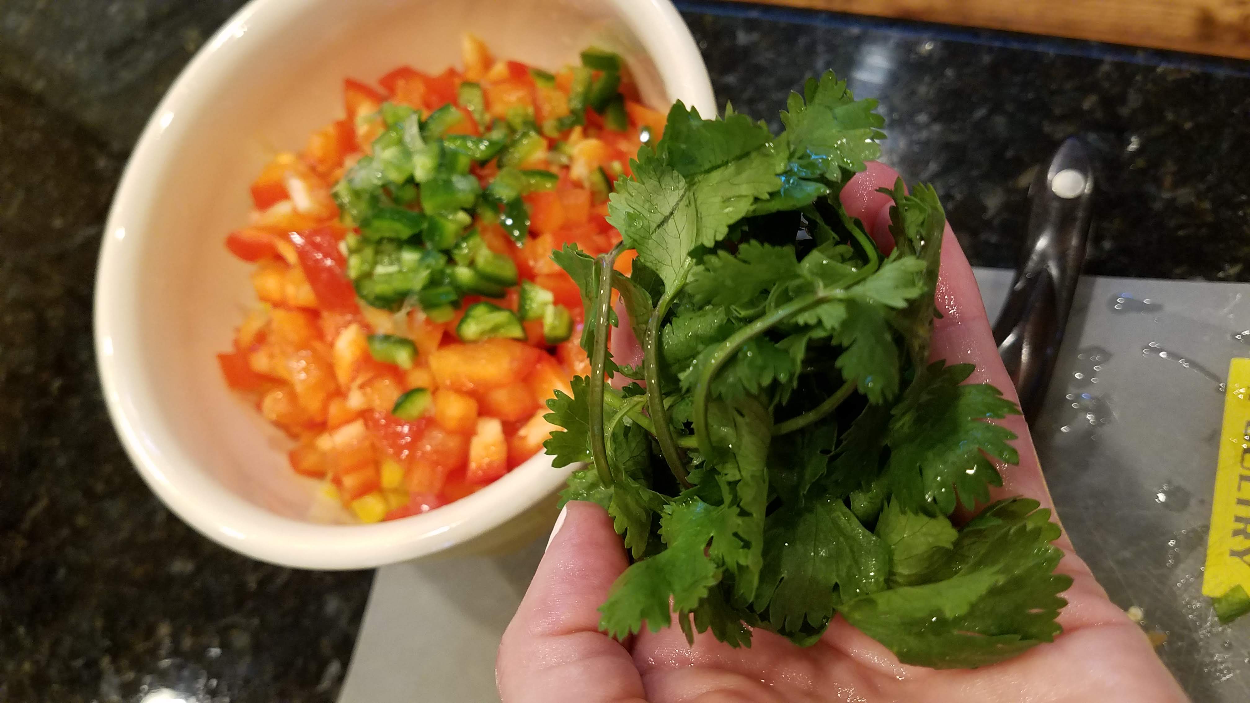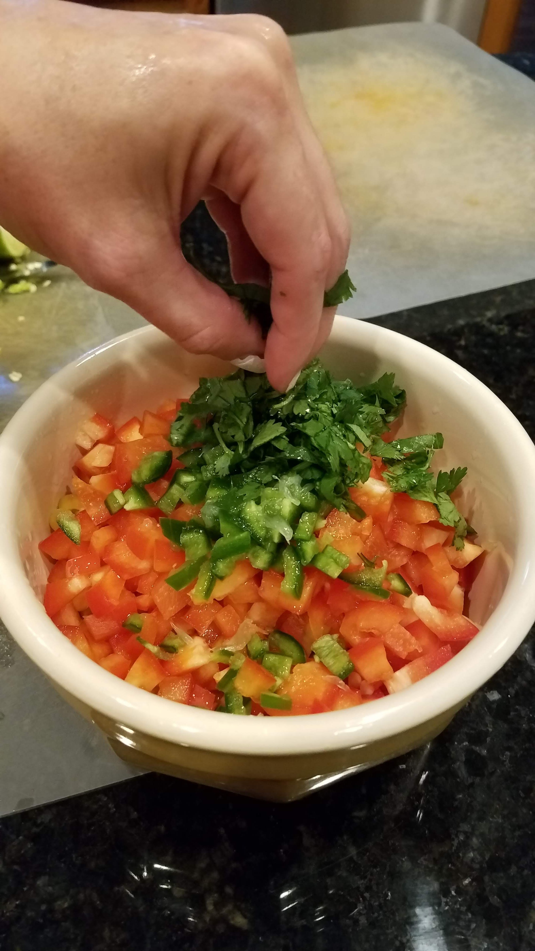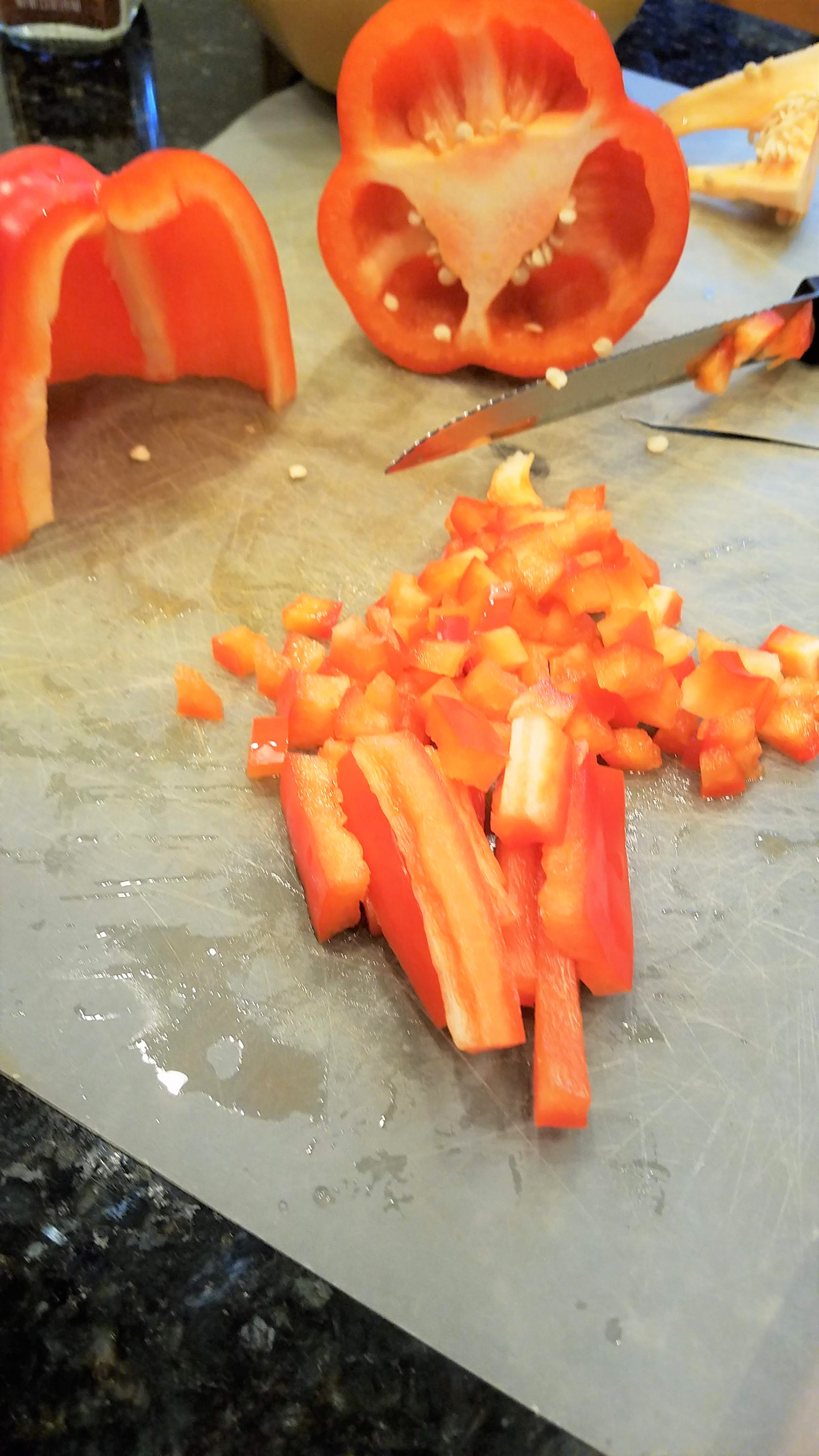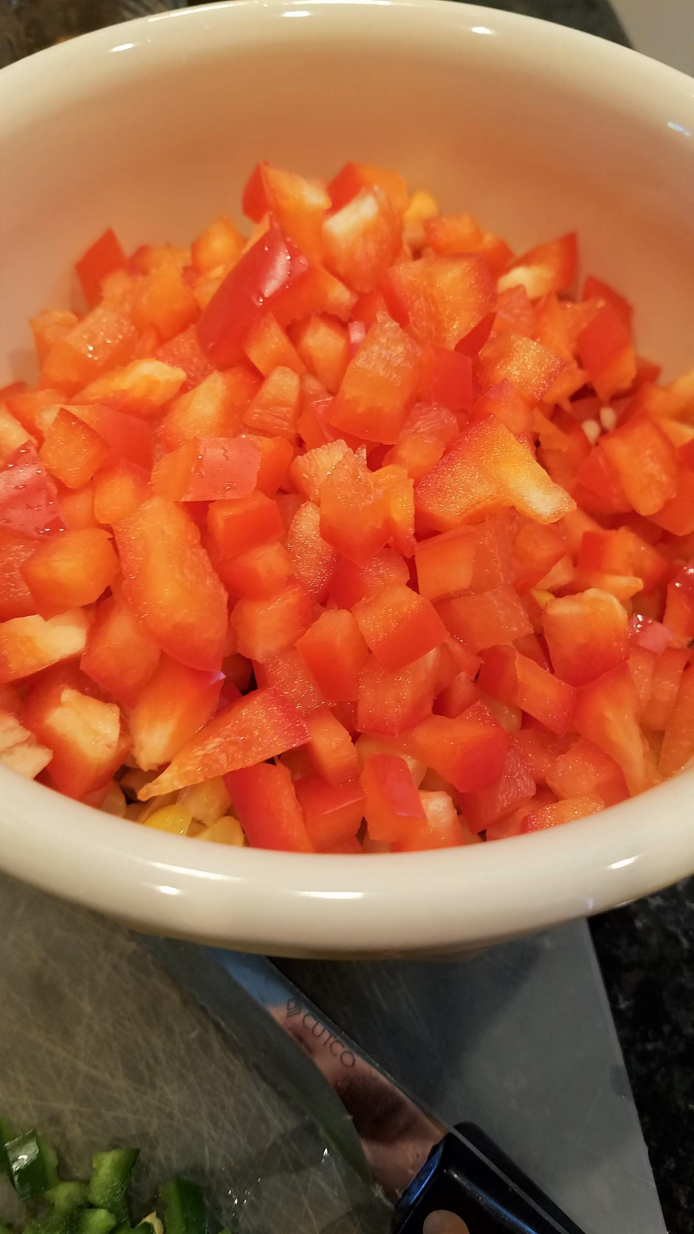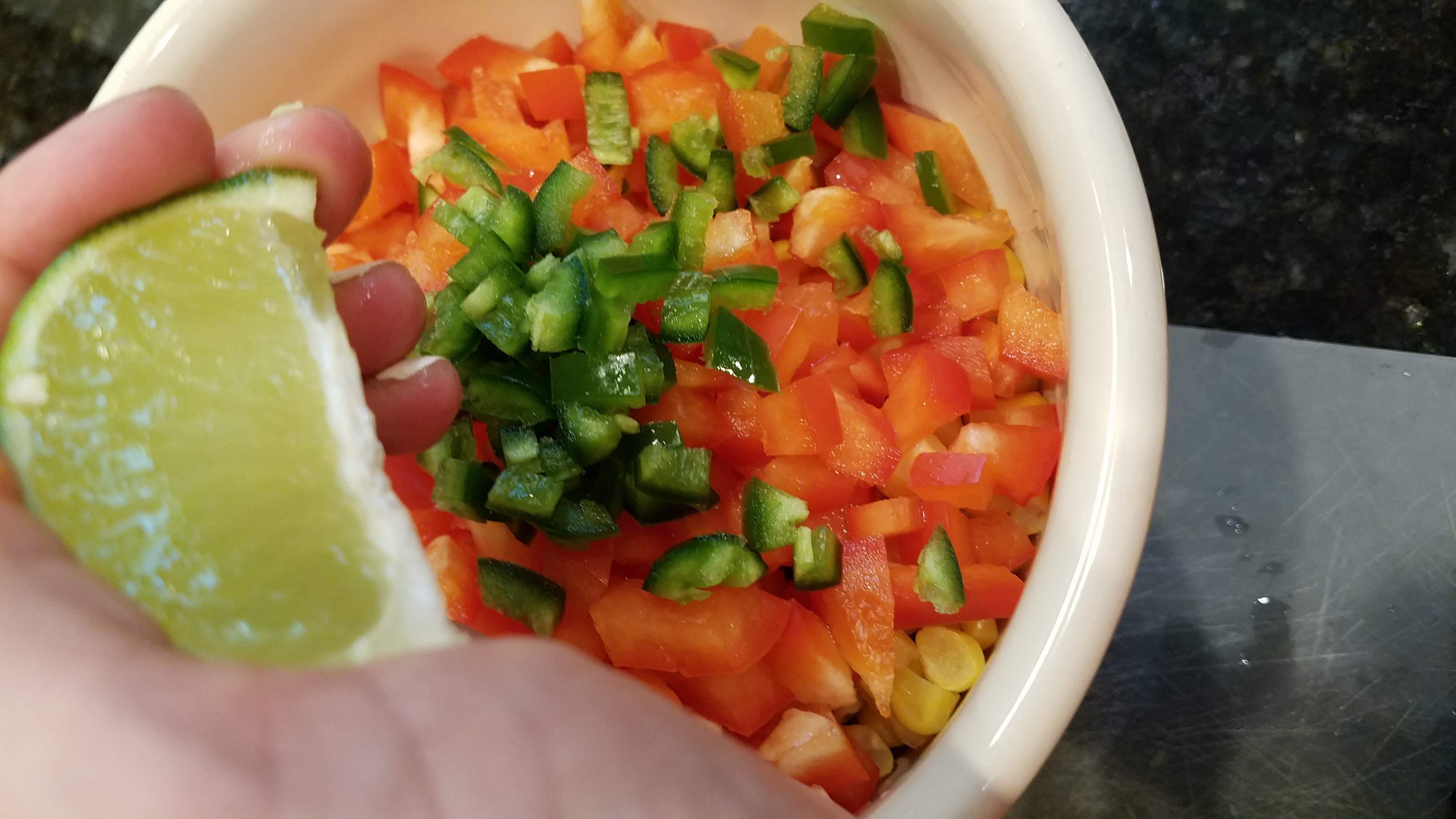 Chop up a small red bell pepper, and de-seed and chop a jalapeno. I usually chop everything up to be about the same size as the corn kernels.