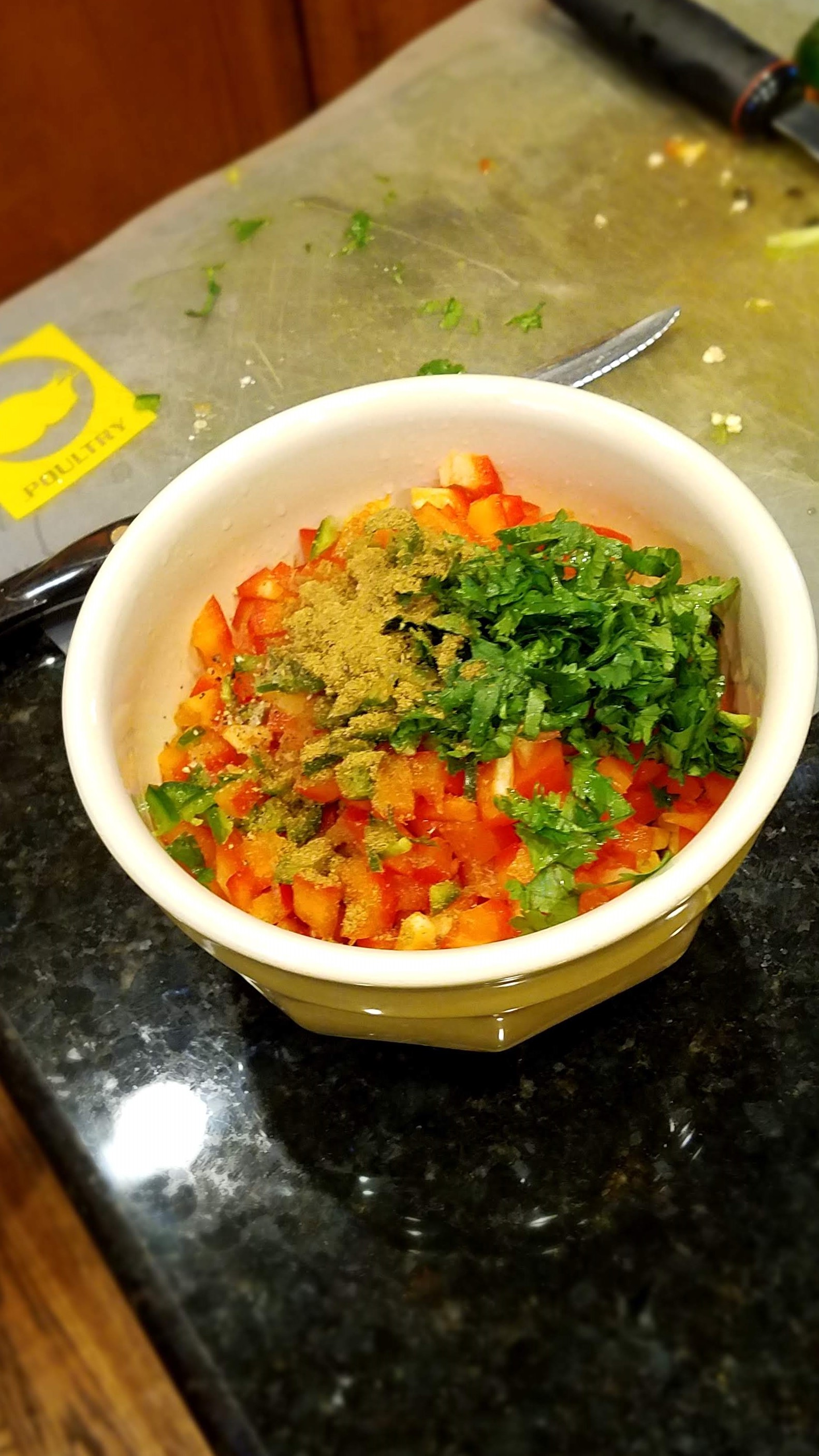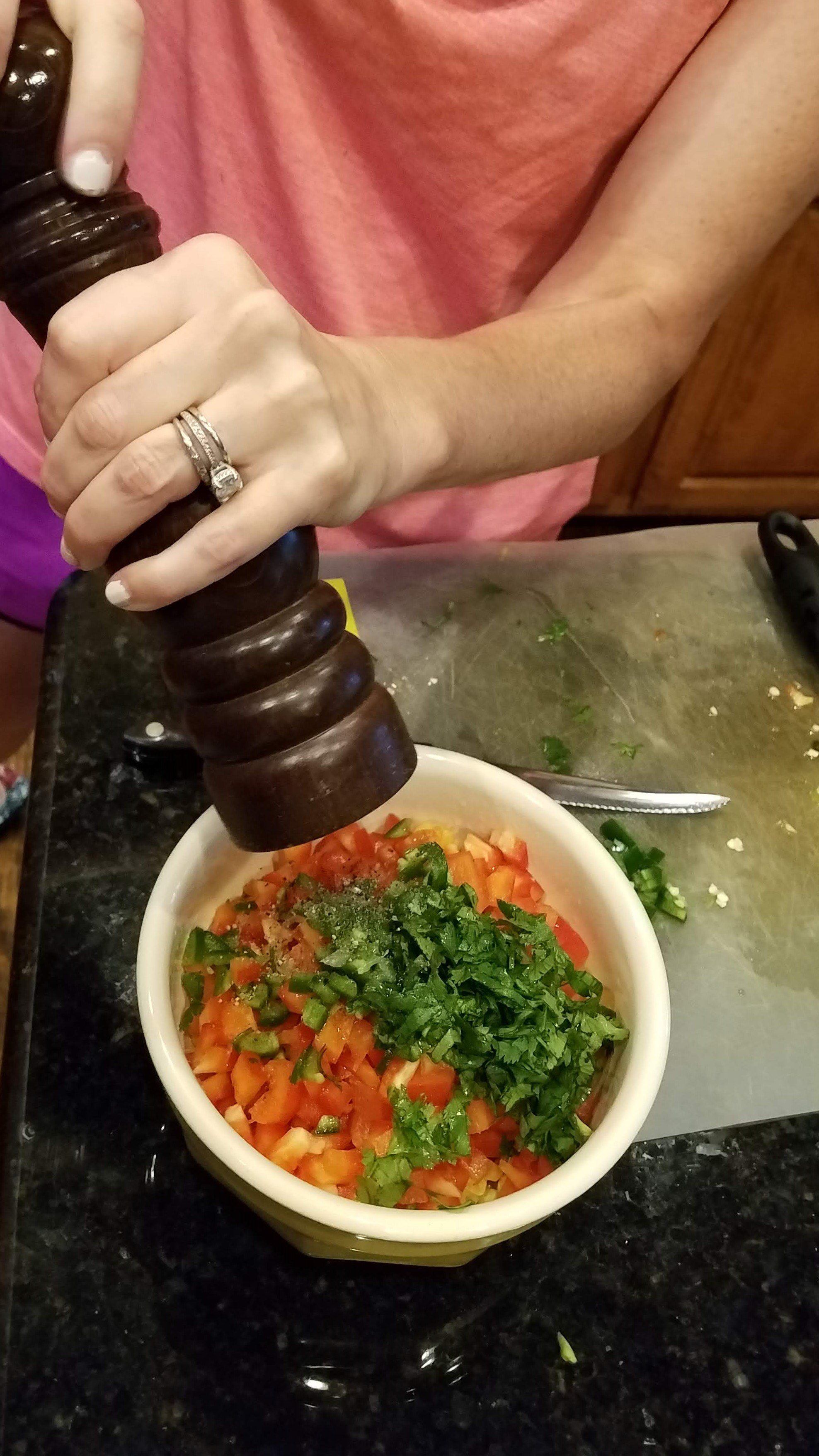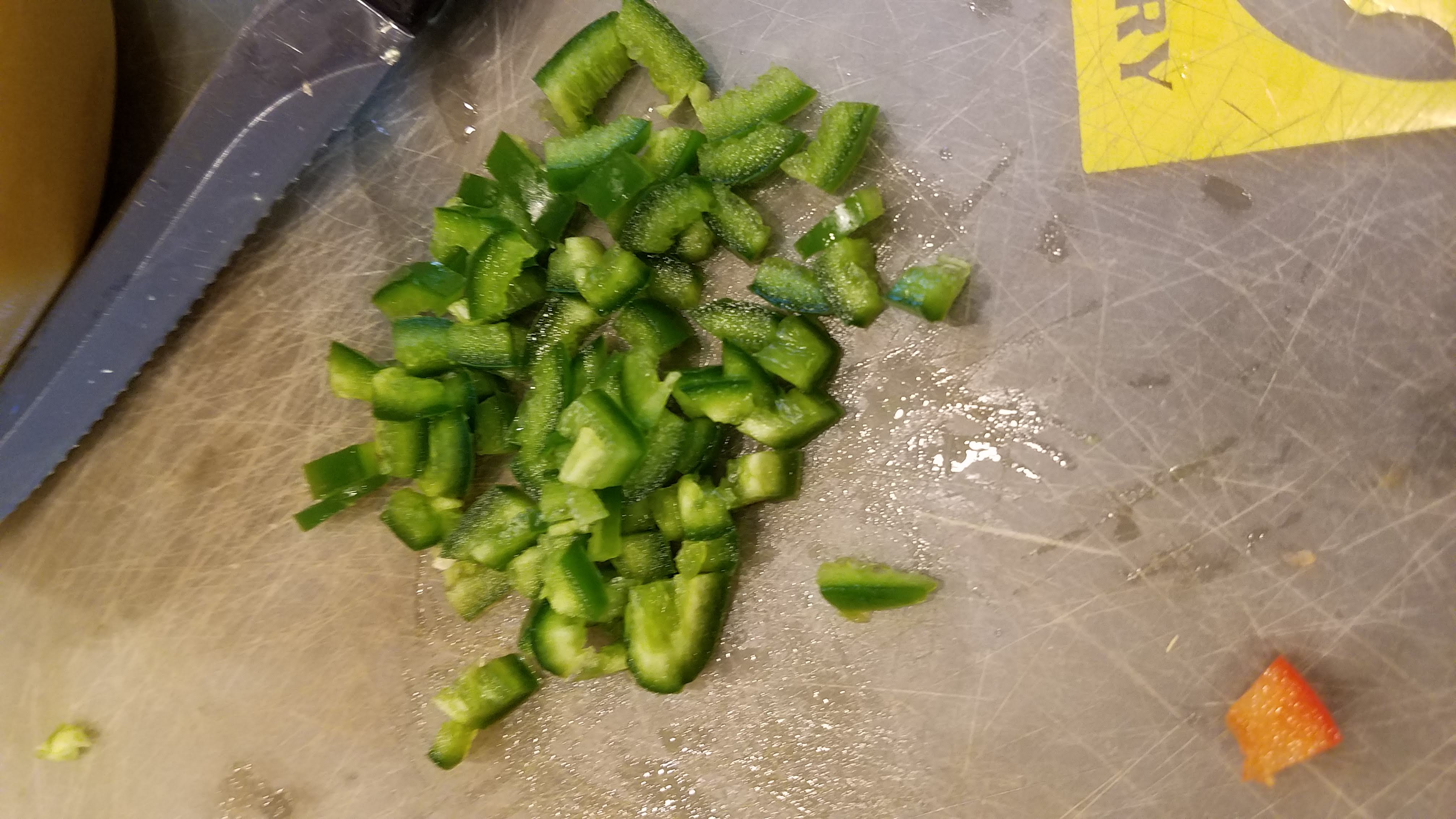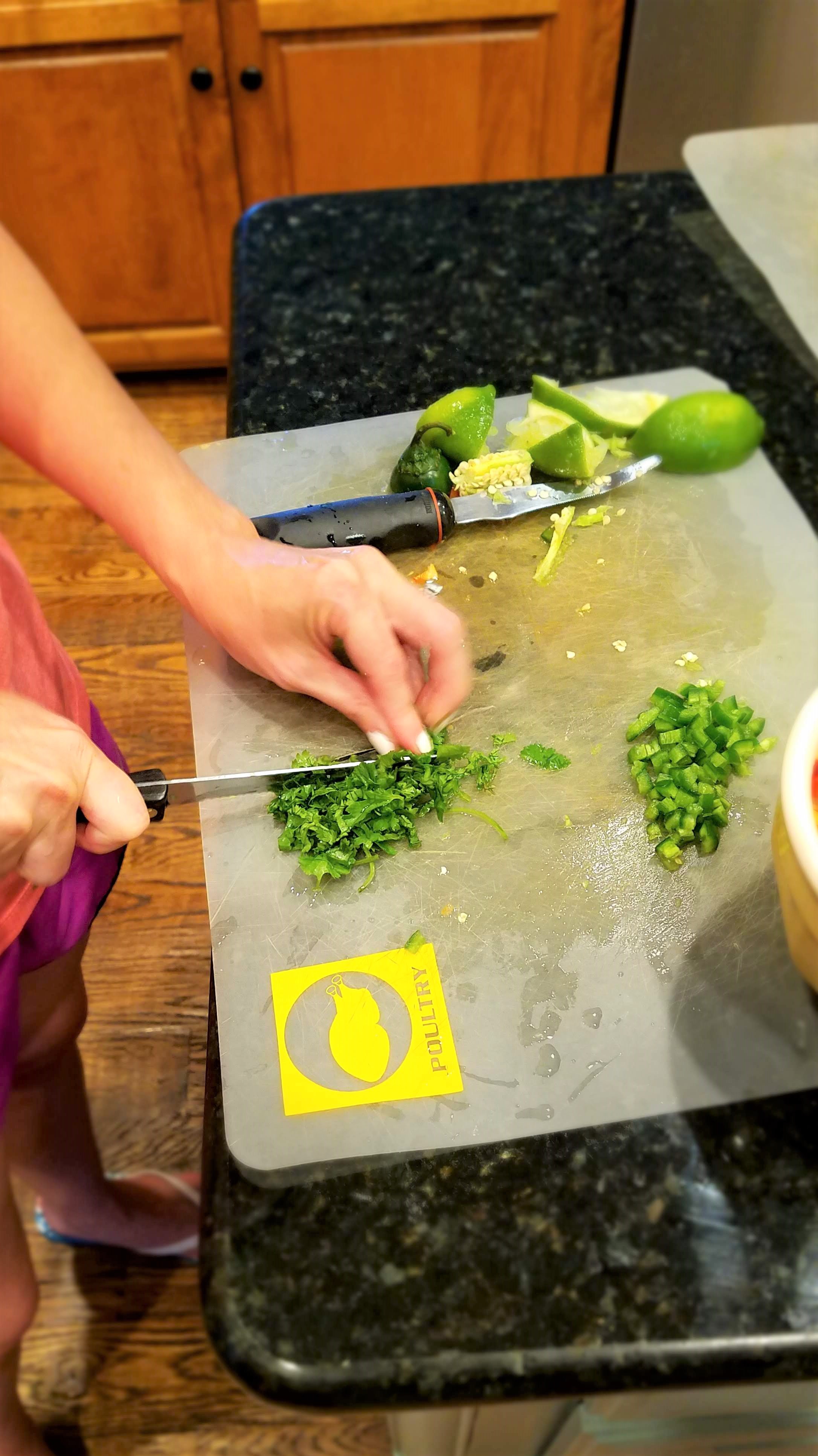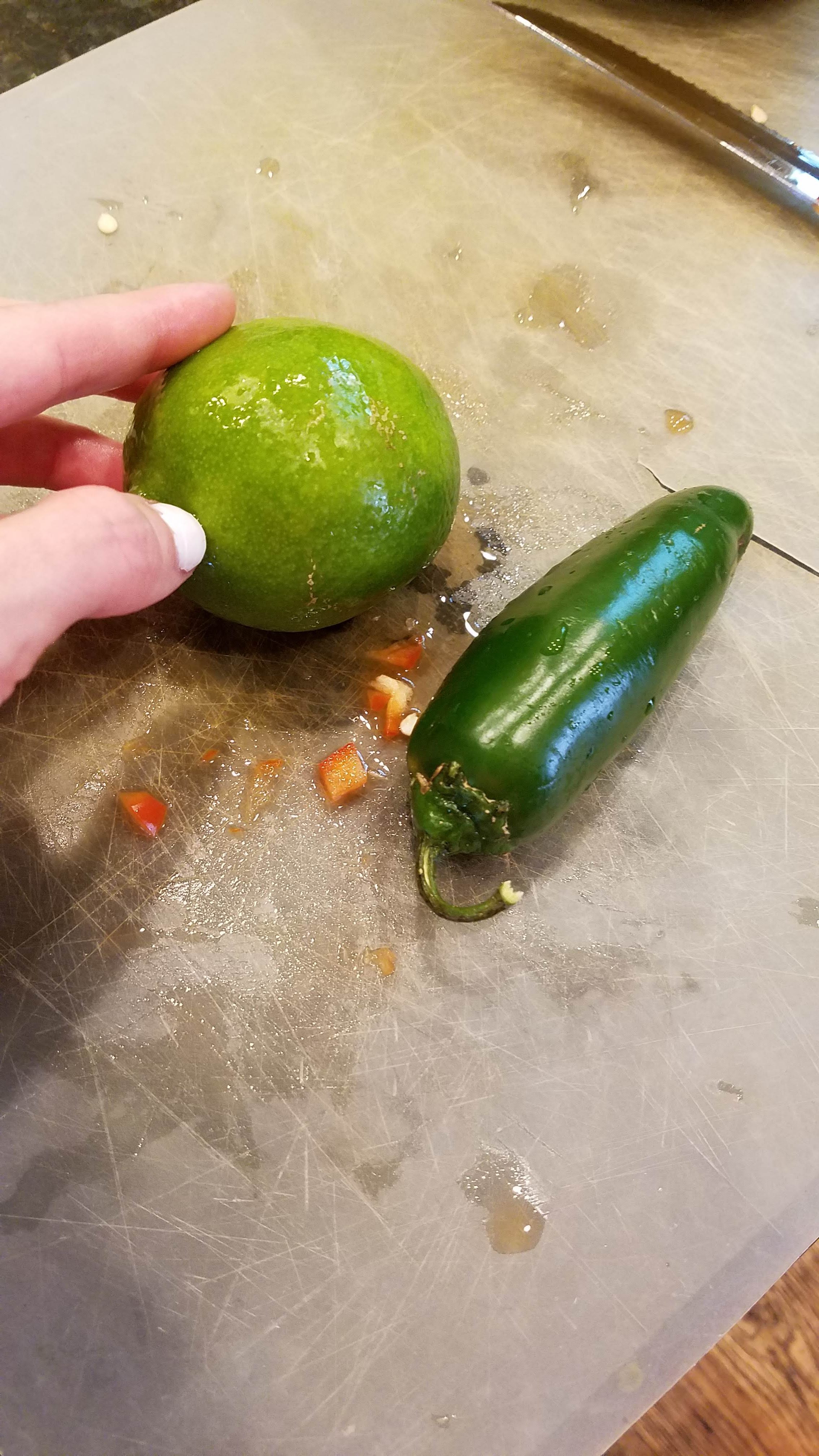 Chop up a small red bell pepper, and de-seed and chop a jalapeno. I usually chop everything up to be about the same size as the corn kernels.