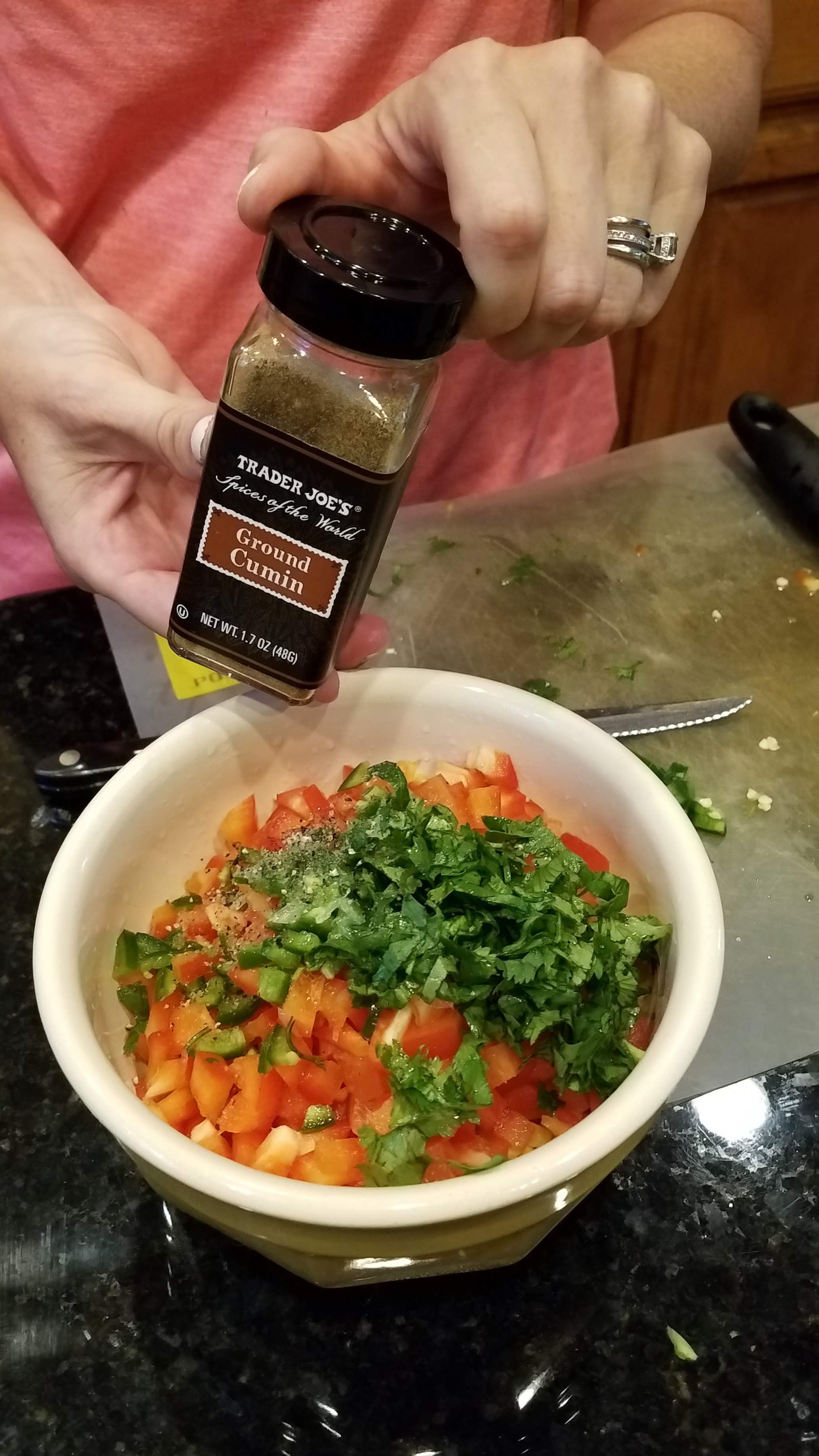 Chop up cilantro…..about 1/4 cup….or more if you love the flavor! Add lime juice + salt + a tsp of olive oil. And the key ingredient is CUMIN! I use a heaping tablespoon….and sometimes a little extra. 🙂