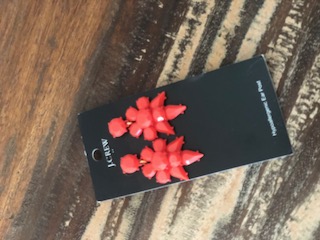 J. Crew red statement earrings, Anthropologie exclusive Capri Blue Fir & Firewood Candle, Faux Fur Scarf, Dionis Peppermint Lip Balm, Acrylic “Cheers” champagne flutes