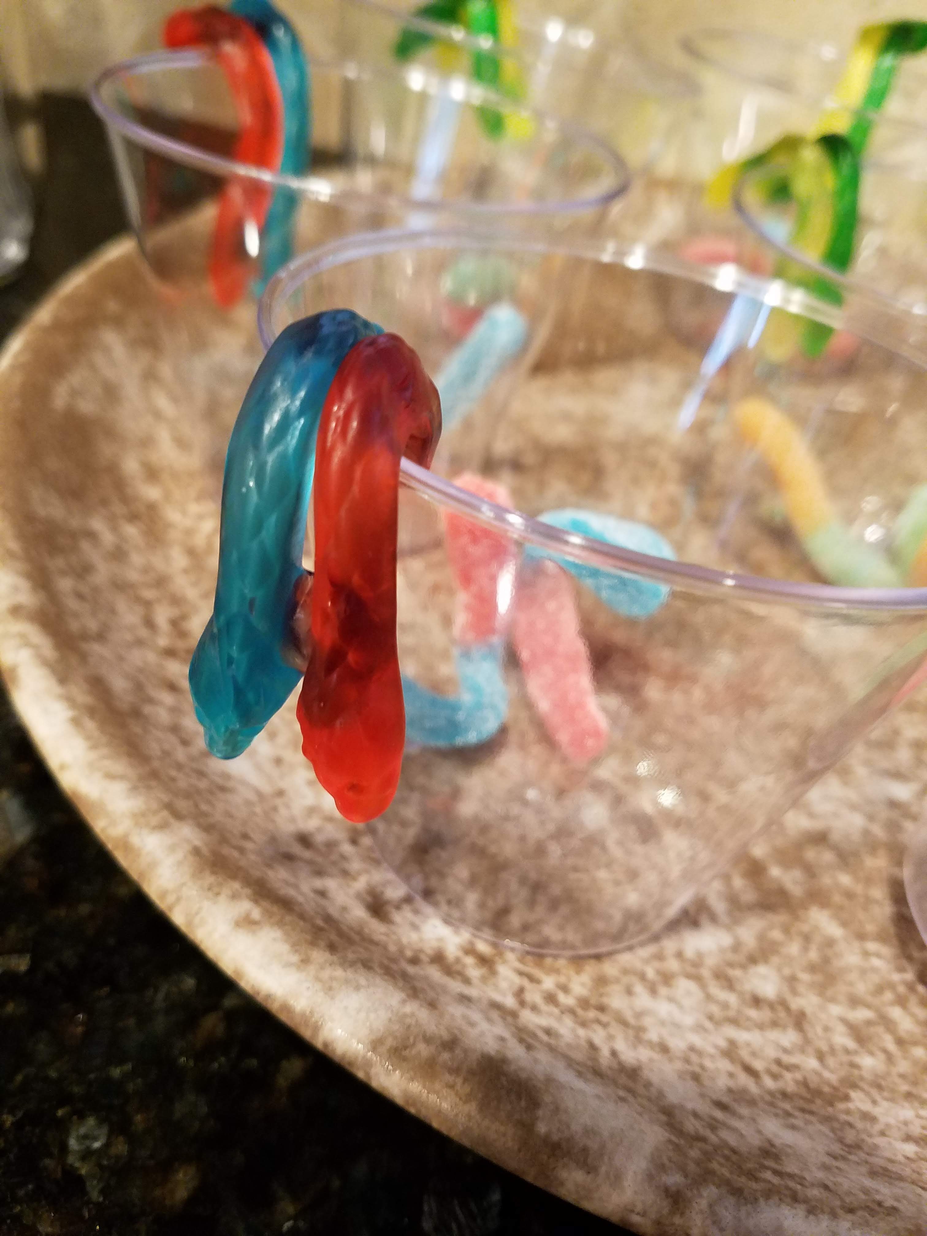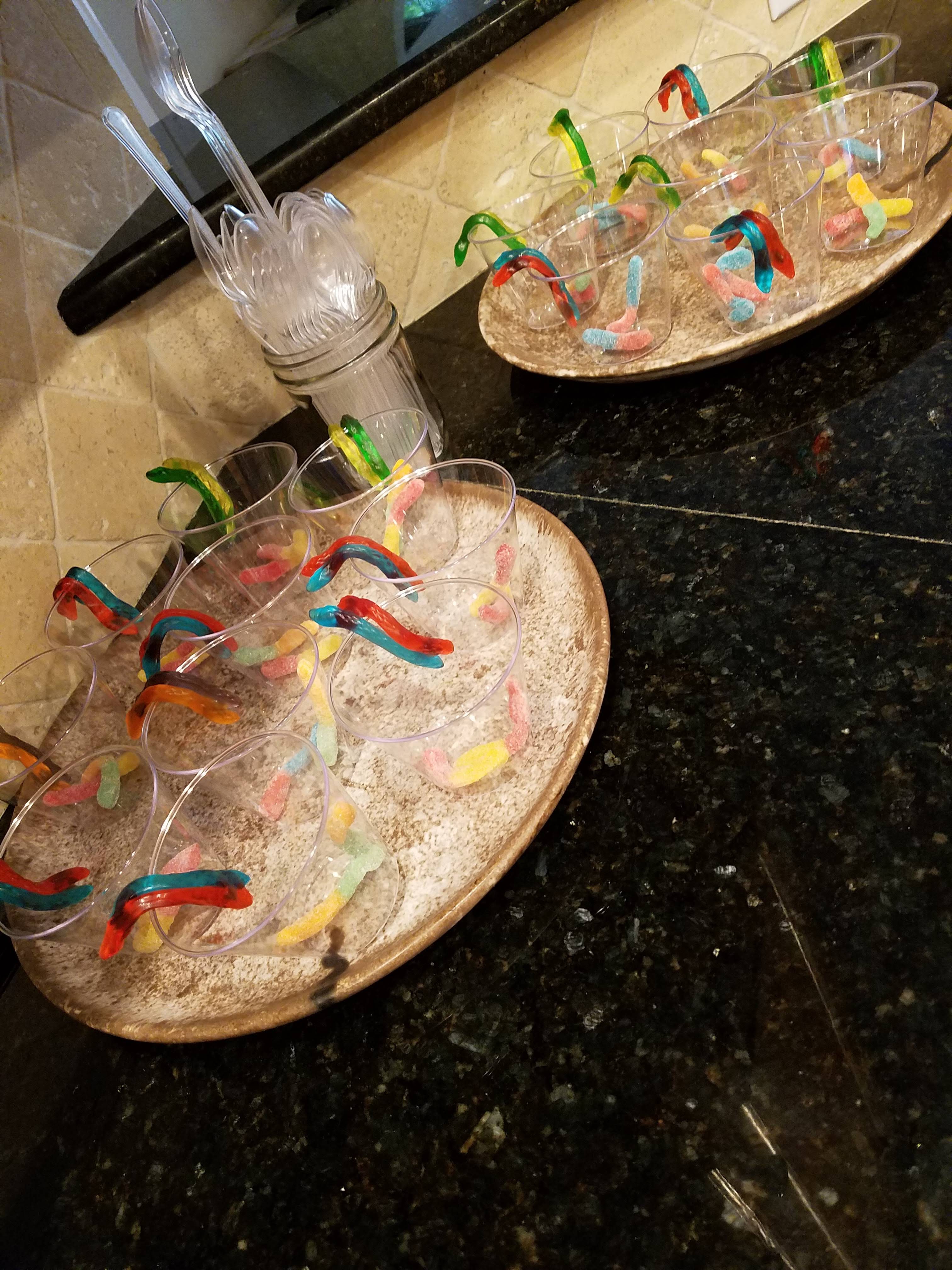 - When ready to serve, add one to two gummie worms or gummy snakes or gummie bugs and spiders to each clear plastic cup.