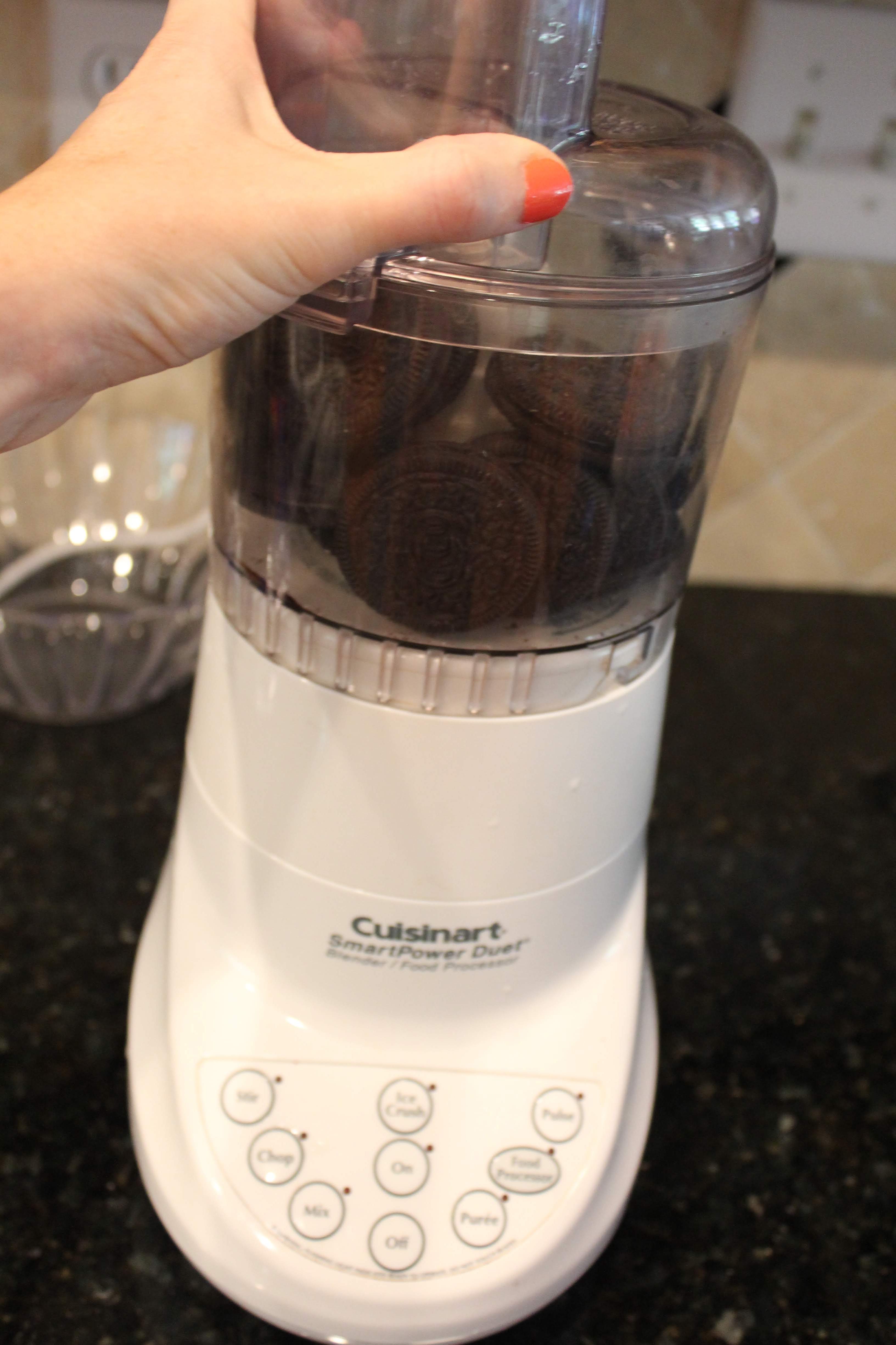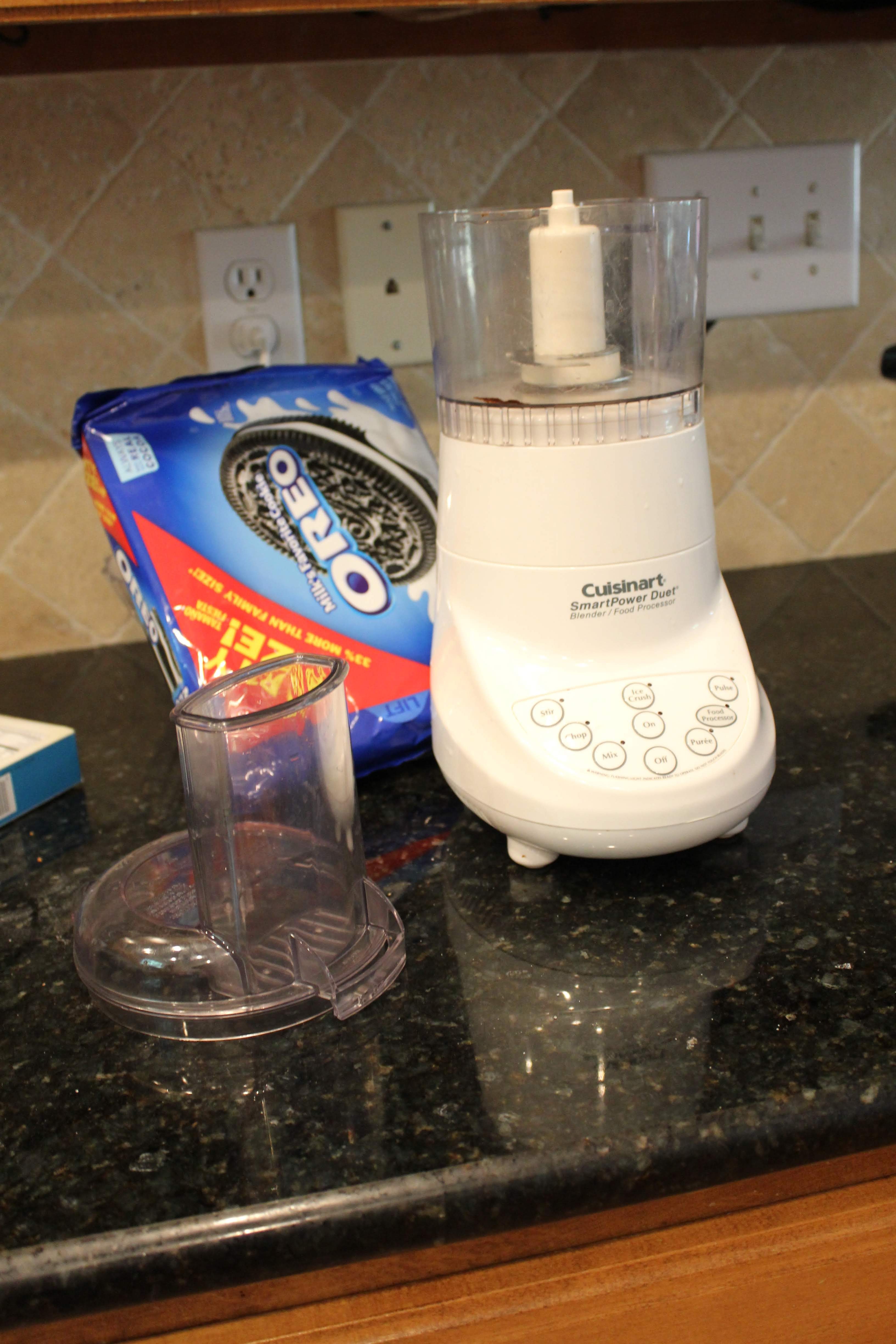 - Using a food processor (or a large baggie and and a meat mallet), process the oreos until they are a mostly powder-y consistency…be careful to not over-process and make gummy with the cookie cream mixed in. Set aside.