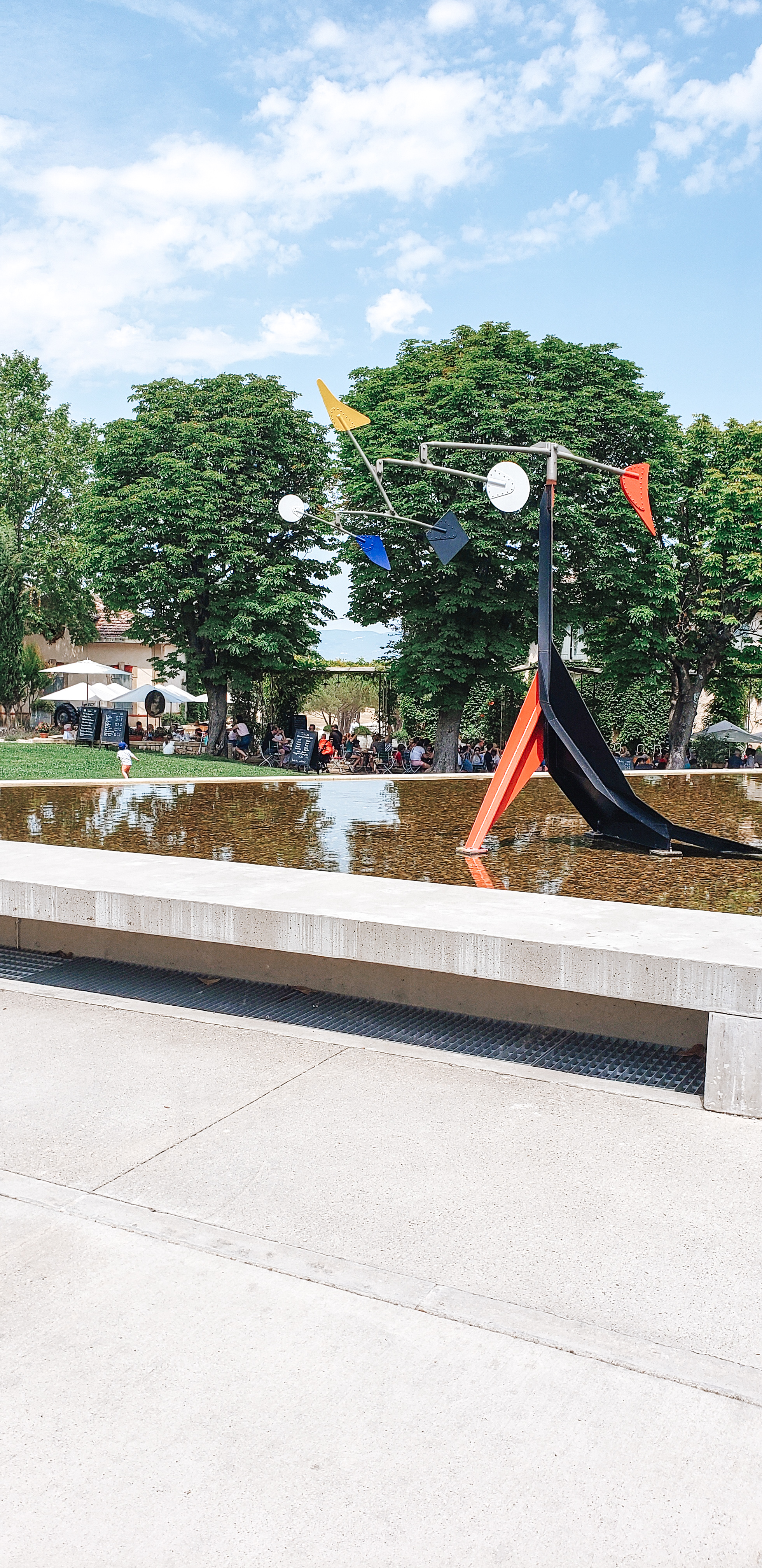 Not only is Aix known for being Cézanne’s birthplace, but it is also known for its beautiful tree-lined streets and open air markets. We did a little shopping…surprise, surprise….and picked up a few little treats. On the way out of town we made a quick stop at Cezanne’s home and got a peek at his gardens! We knew we wanted to stop at another winery in the Provençal region, and Adam came across Château La Coste. It was such a different feel and setting than Bodin Vins de Cassis. This vineyard had the original home and tasting spaces, but they had also built a very modern building as an event space and filled it with a museum of very modern works of art. It was pretty extraordinary in itself to see the two very different worlds together in one vineyard/winery, and the wine was delicious! They also had a great olive oil selection from olives on their property! Makes my mouth water to remember it all! 🙂 We snagged a bottle to take with us hoping it would stay chilled for a later stop at another beach….hmmmmm…